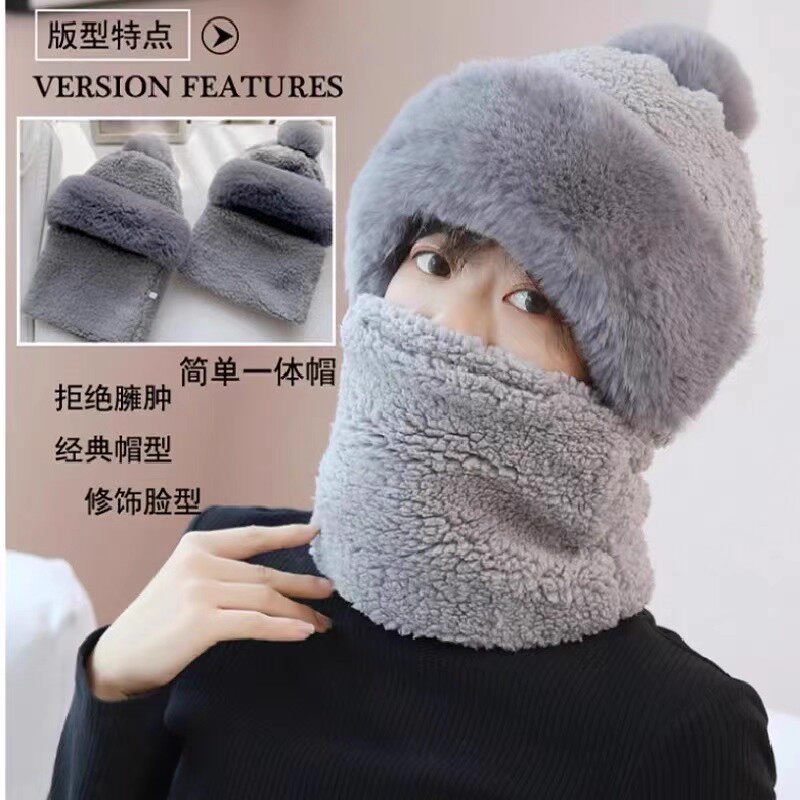 围巾帽子手套一体女连帽冬季帽可爱保暖围脖毛绒冬天三件套厚防寒