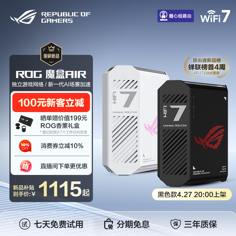 ROG无线AI路由器魔盒AIR千兆穿墙全屋WiFi7电竞AI场景加速RGB电竞灯效6根内置5T5R天线支持4K QAM及MLO技术