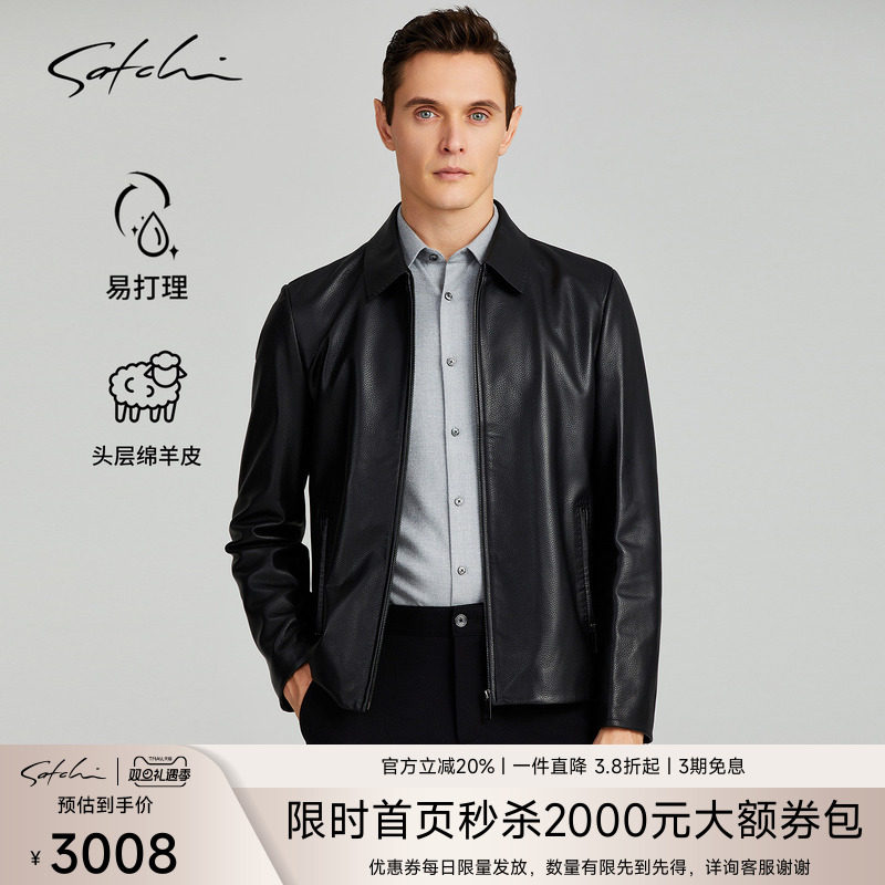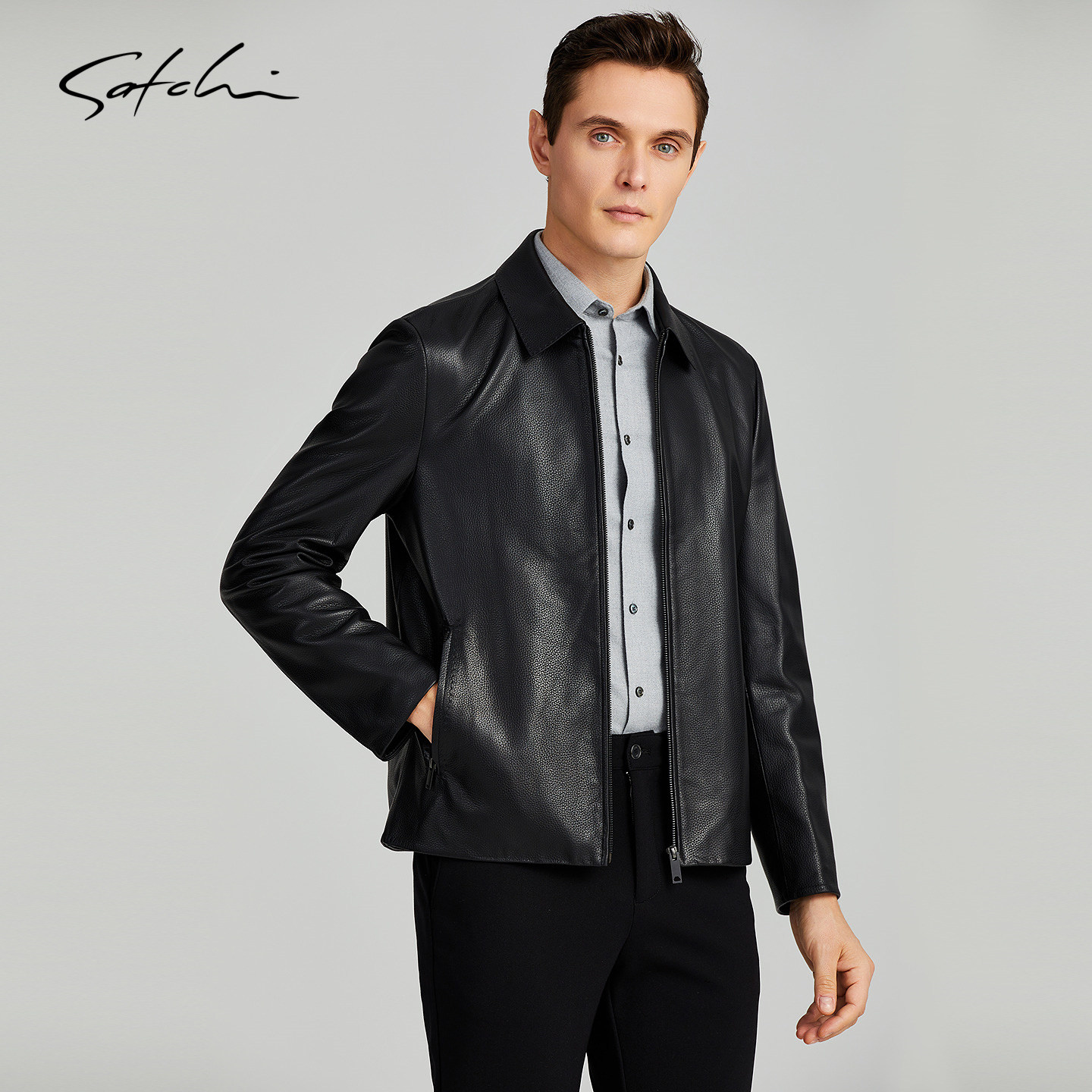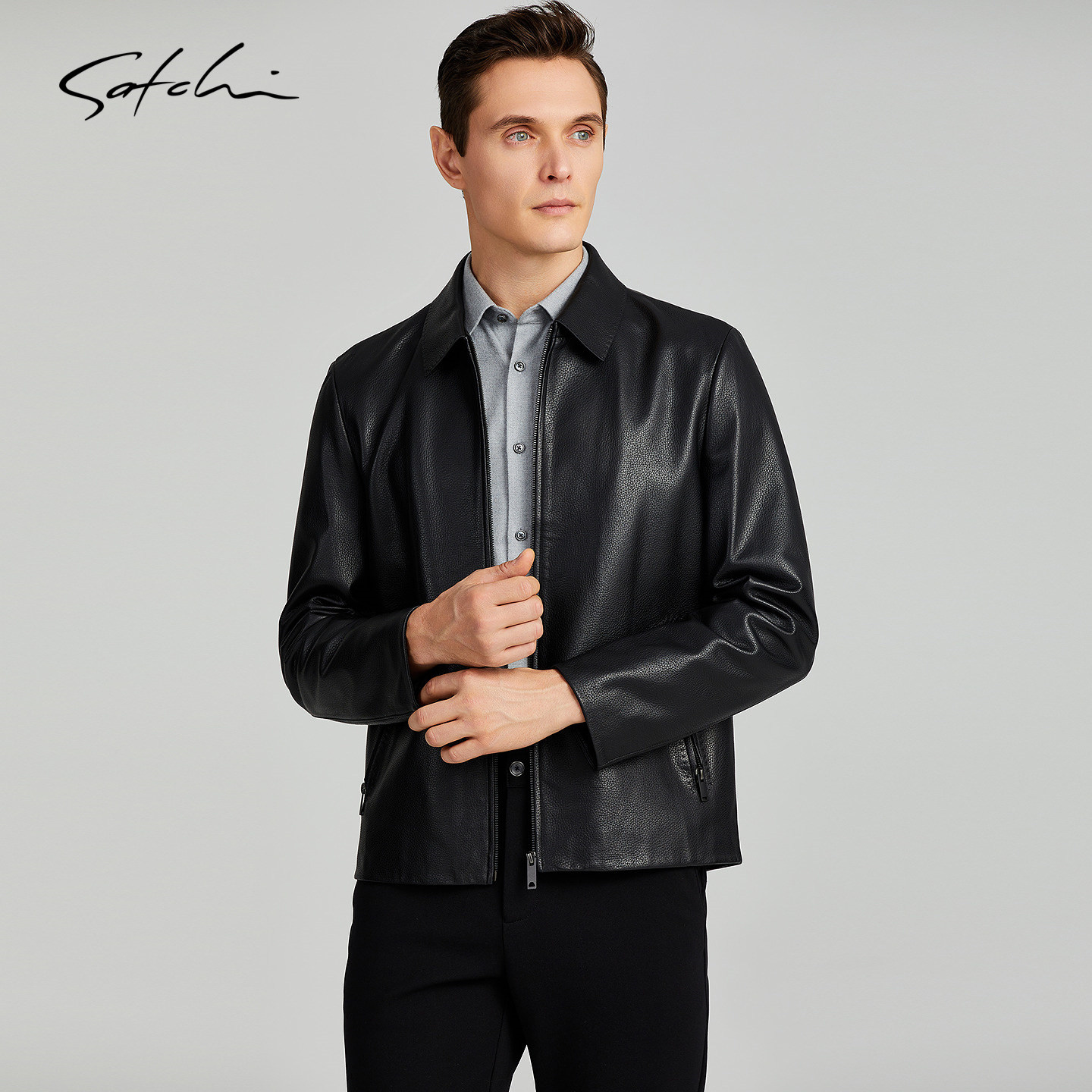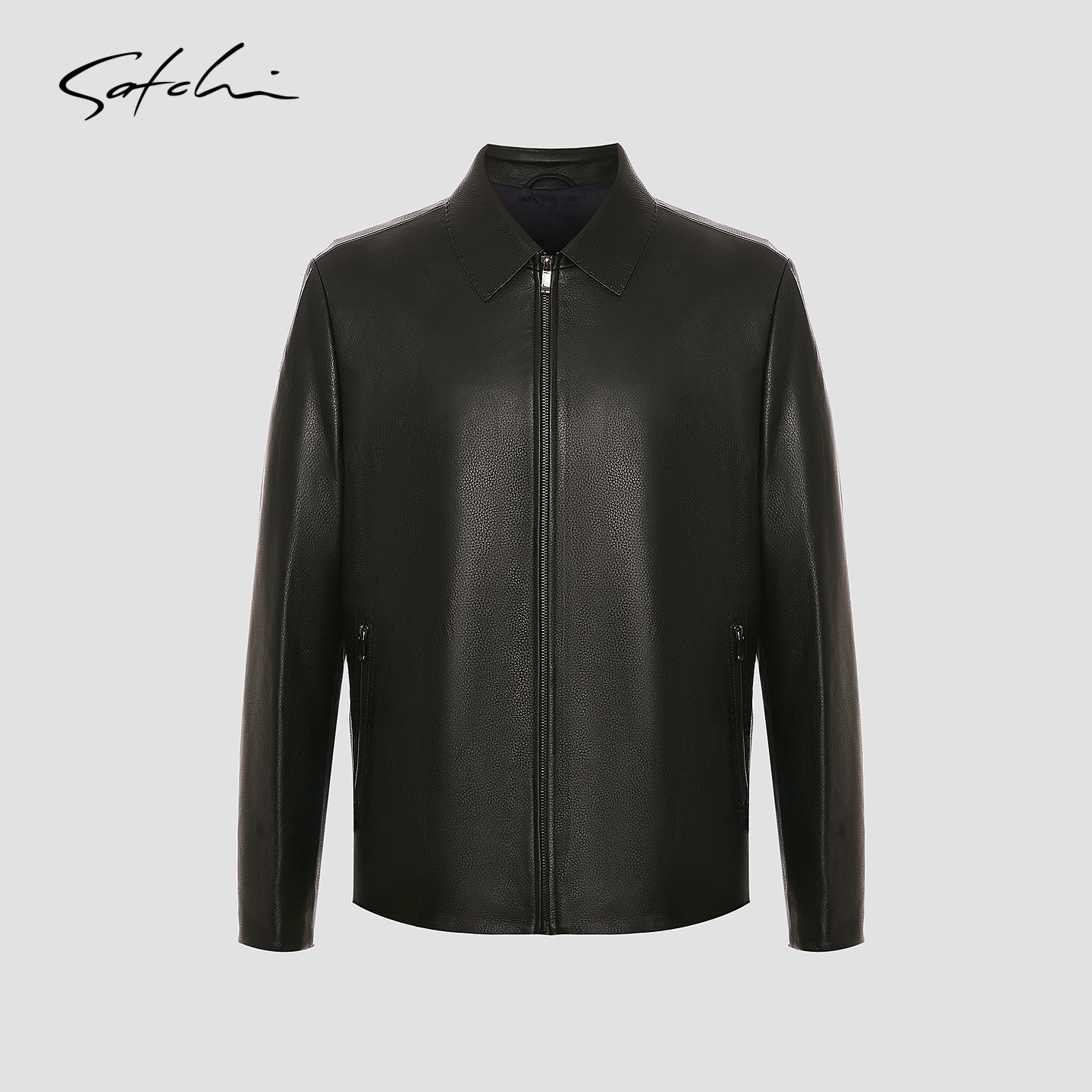 SATCHI沙驰男装男士真皮皮衣冬季新款绵羊皮荔枝纹短款夹克外套男
