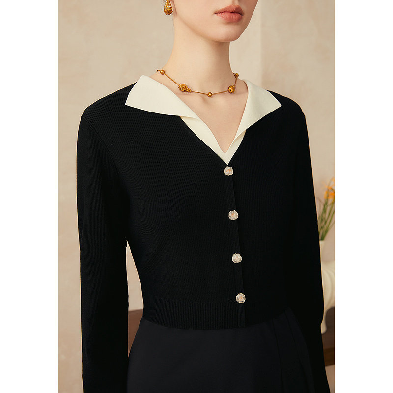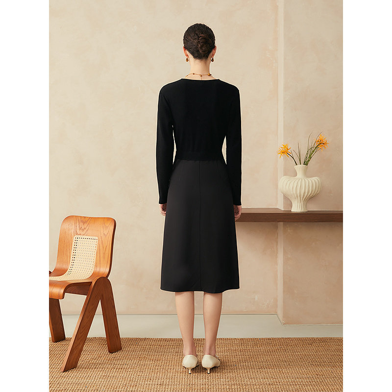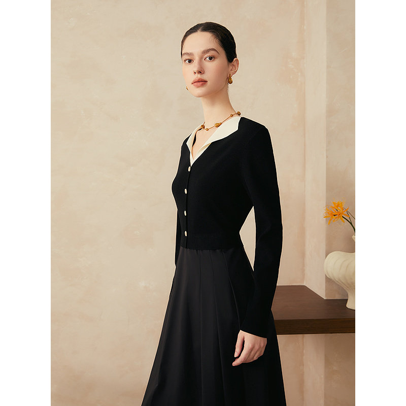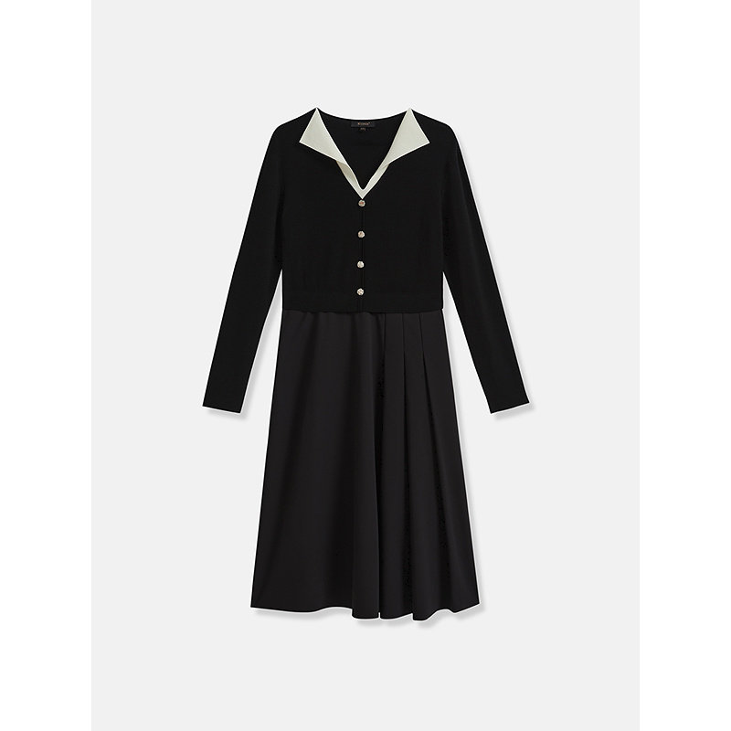YINER音儿2025春季新款法式优雅撞色翻领假两件收腰小A字连衣裙