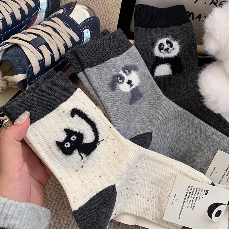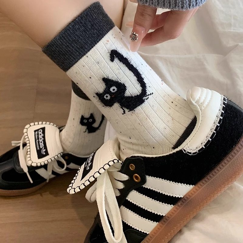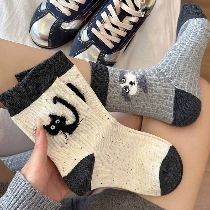 袜子女中筒袜春秋季款棉袜ins潮植绒韩系卡通可爱猫咪长筒堆堆袜