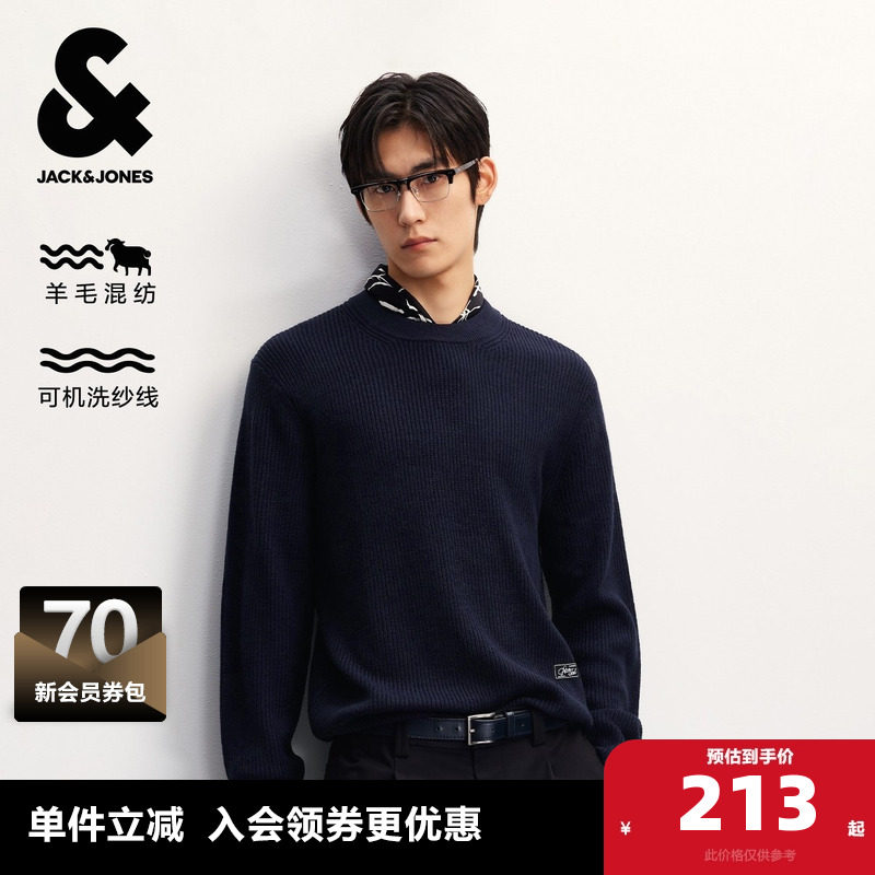 杰克琼斯奥特莱斯男装秋季毛衣针织衫可机洗羊毛面料通勤长袖上衣