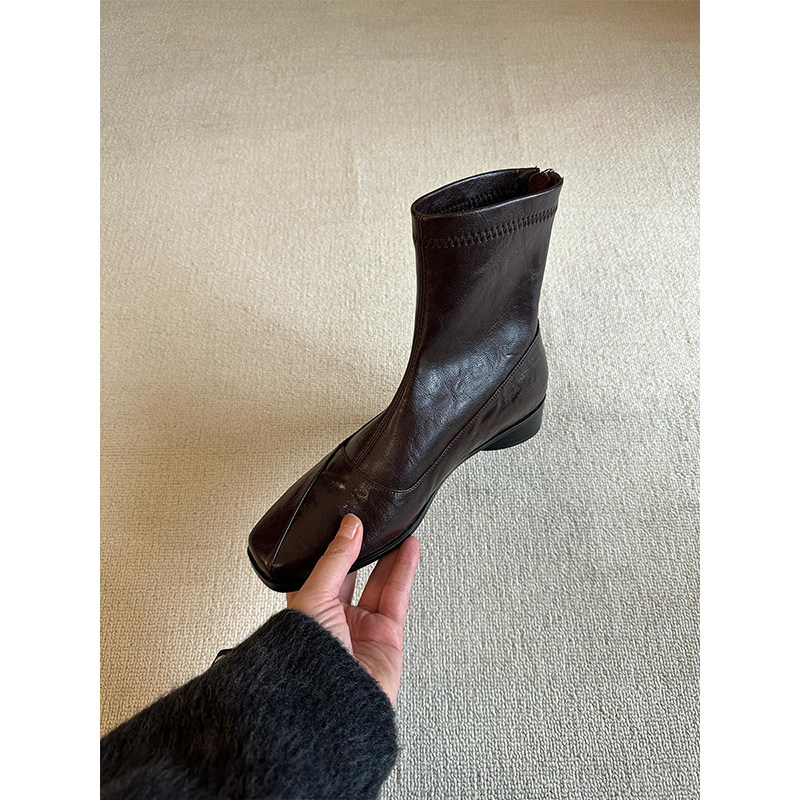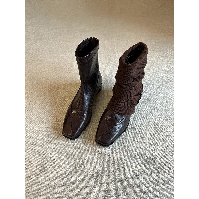 棕色靴子!小个子内增高7CM法式方头靴2025冬新款绒面粗跟短靴女