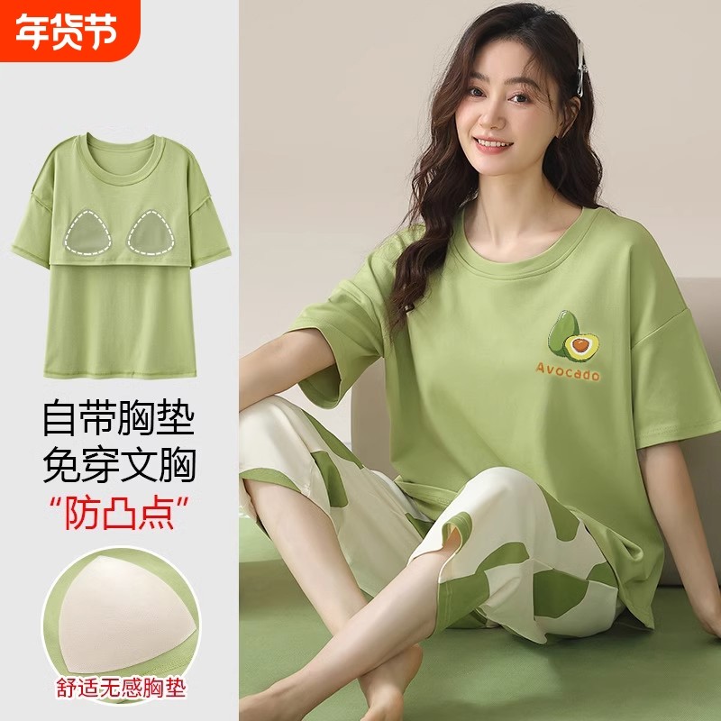 带胸垫睡衣女款夏季短袖薄款七分裤大码免穿文胸防凸点家居服套装