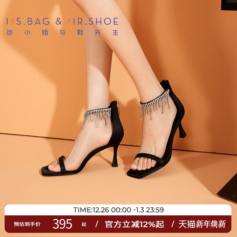 包小姐与鞋先生夏季黑色流苏钻链高跟凉鞋女242120