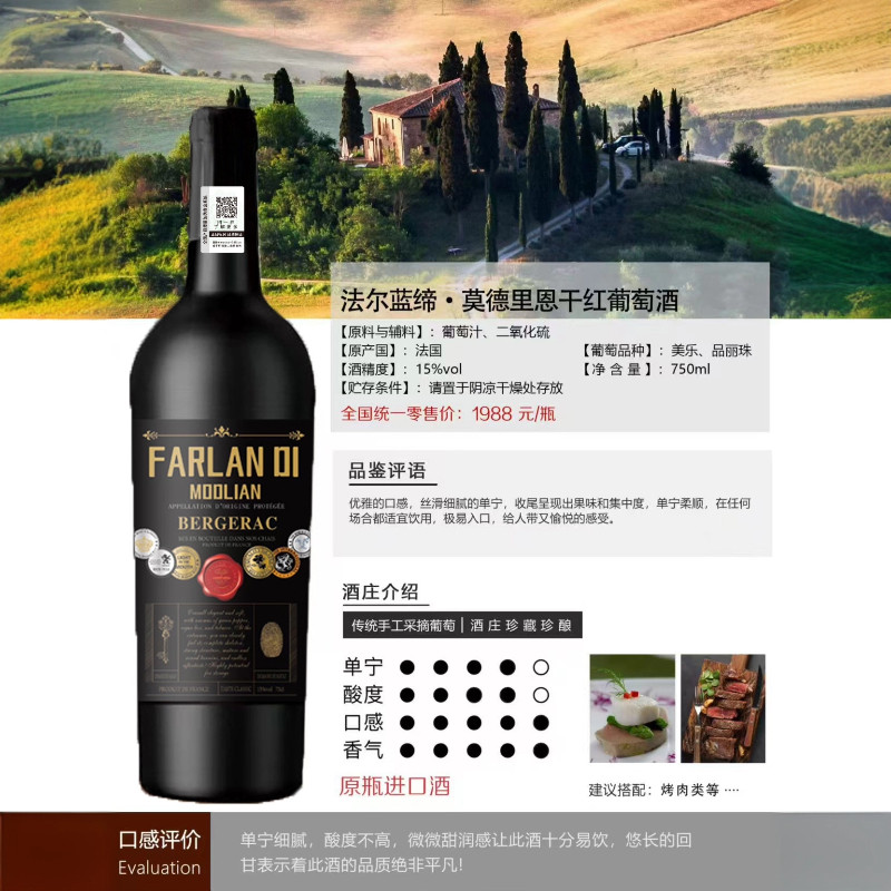 法尔蓝缔·莫德里恩干红葡萄酒法国进口红酒15度AOP级别六瓶整箱