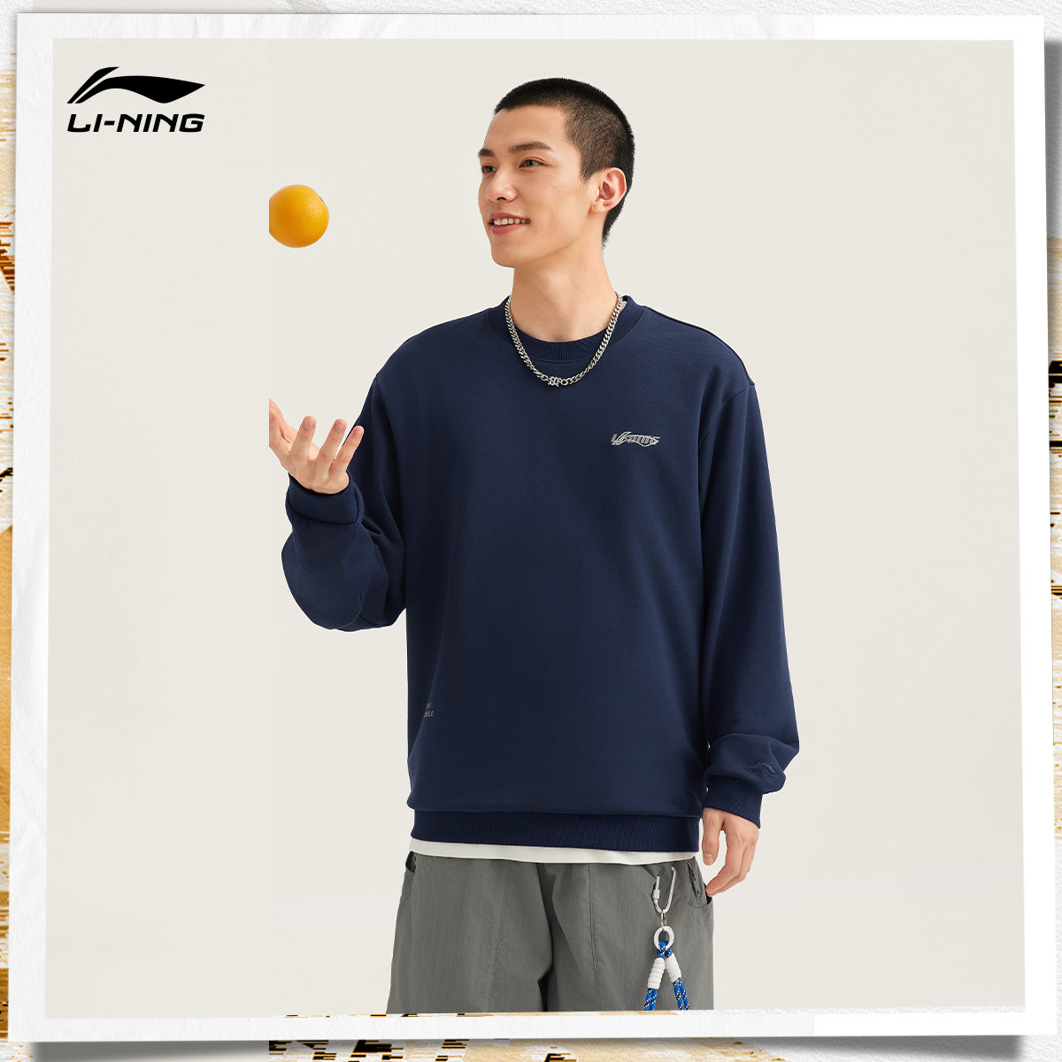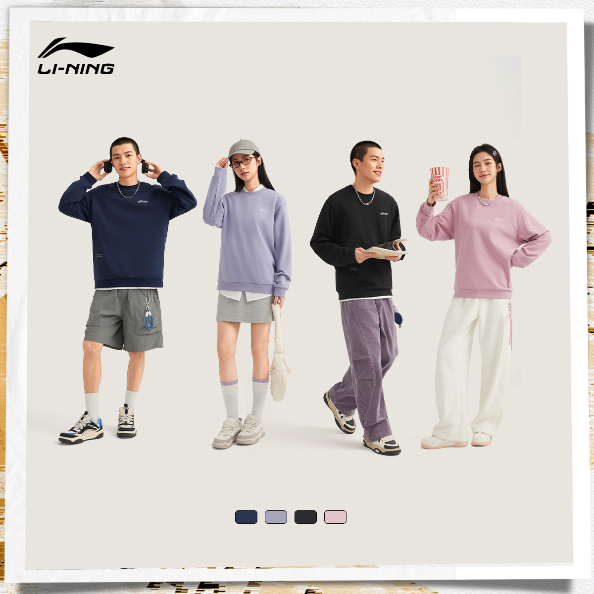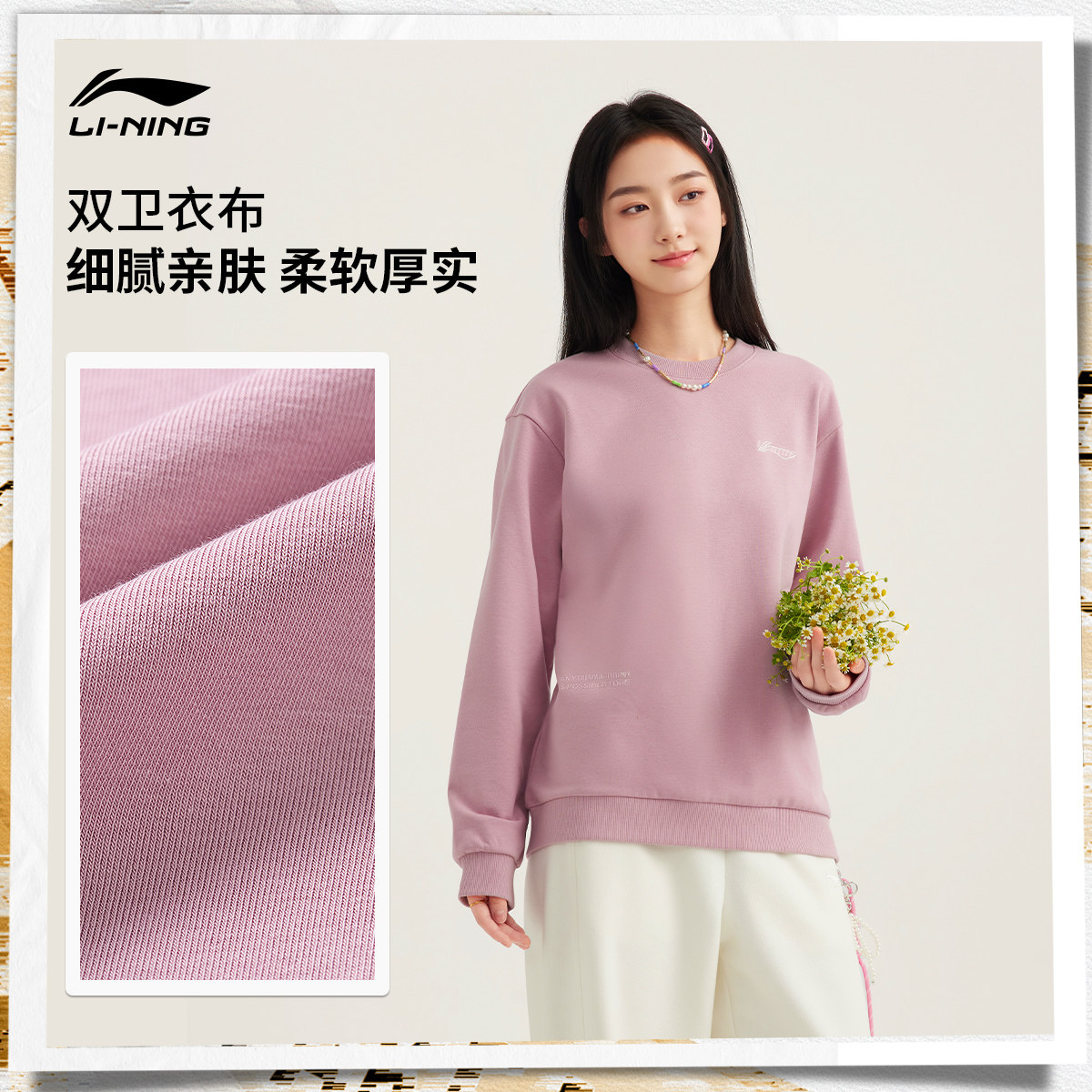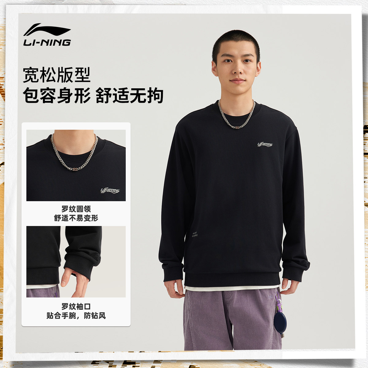 李宁卫衣女春季新款情侣长袖休闲圆领无帽套头衫上衣加绒运动服男