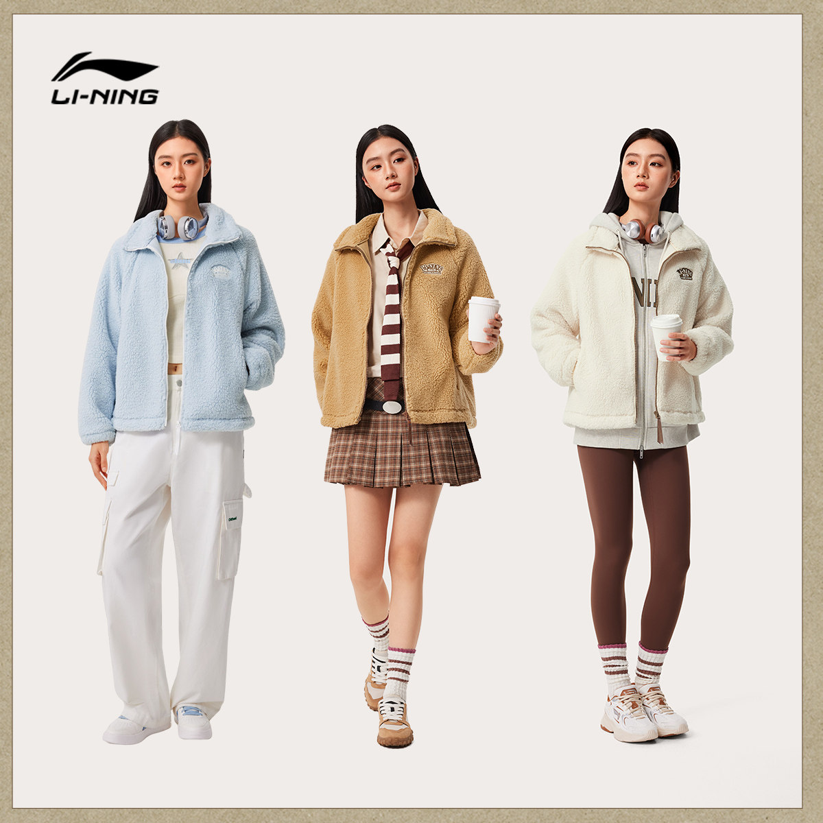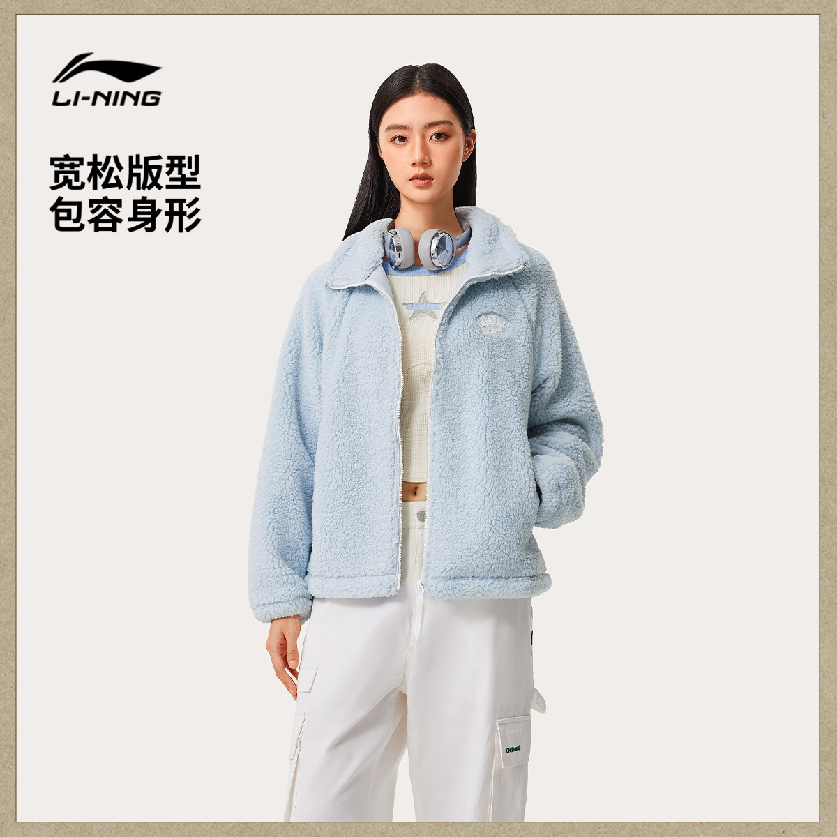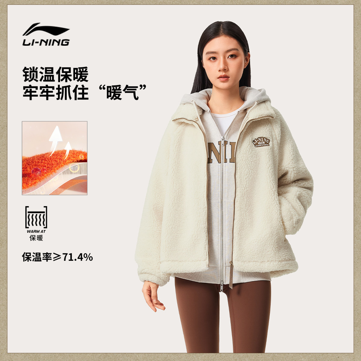 李宁摇粒绒外套女士开衫加绒保暖秋冬加厚保暖运动羊羔绒夹克上衣