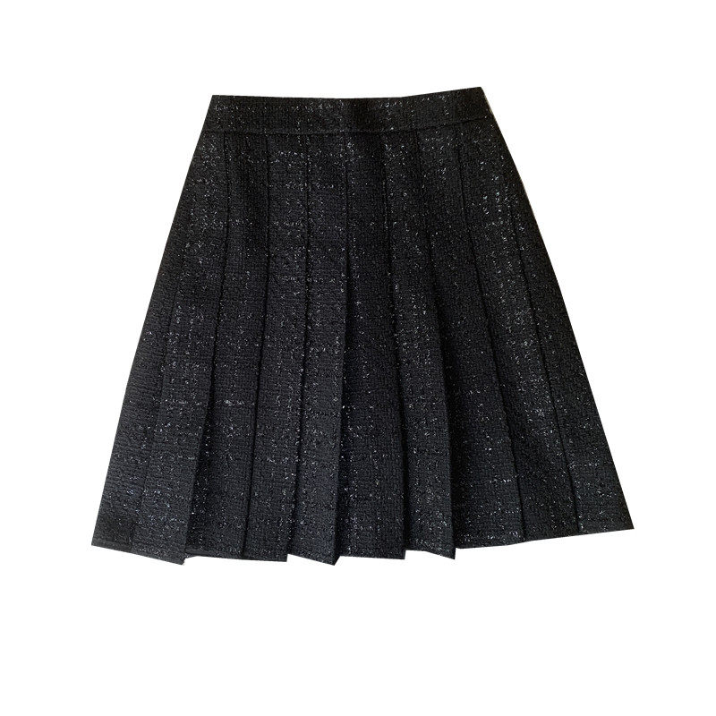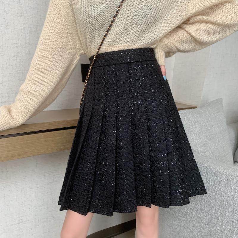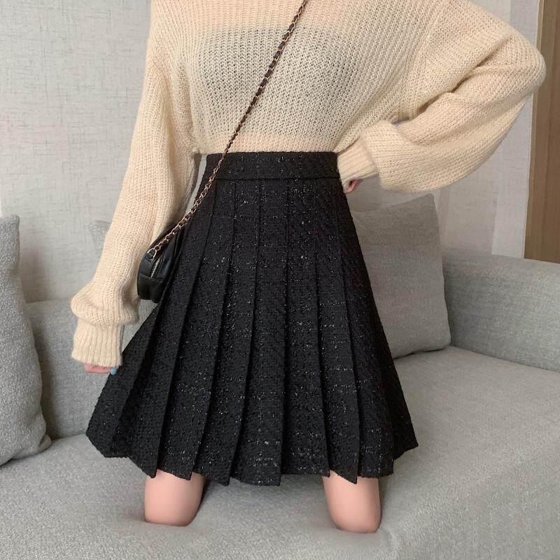 大码黑色毛呢百褶裙半身裙女秋冬中裙高腰显瘦小香风粗花呢a字裙