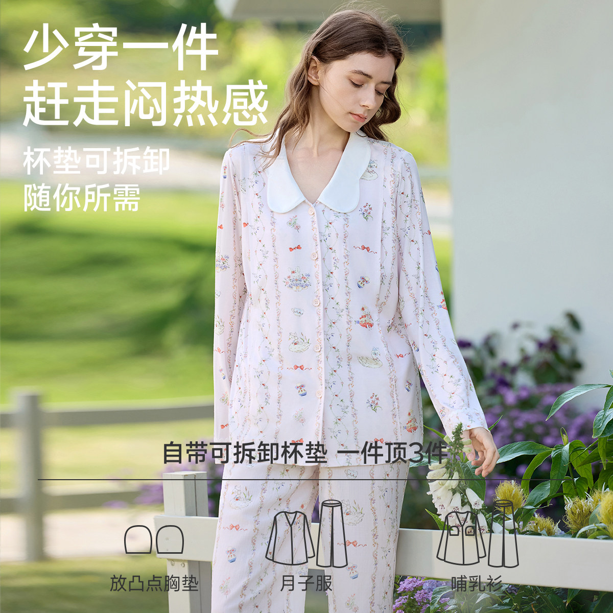 带胸垫奶香风纯棉月子服春秋季产后产妇孕妇睡衣夏薄款哺乳喂奶衣