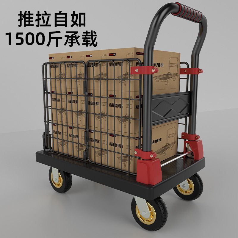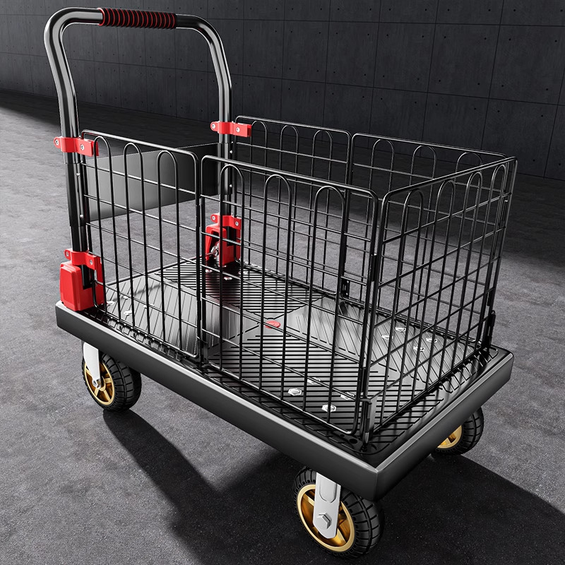 带高围栏小推车静音平板车拉货仓库搬运手推车可折叠家用收纳拖车