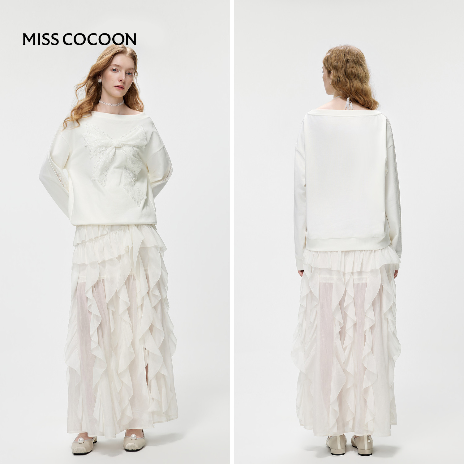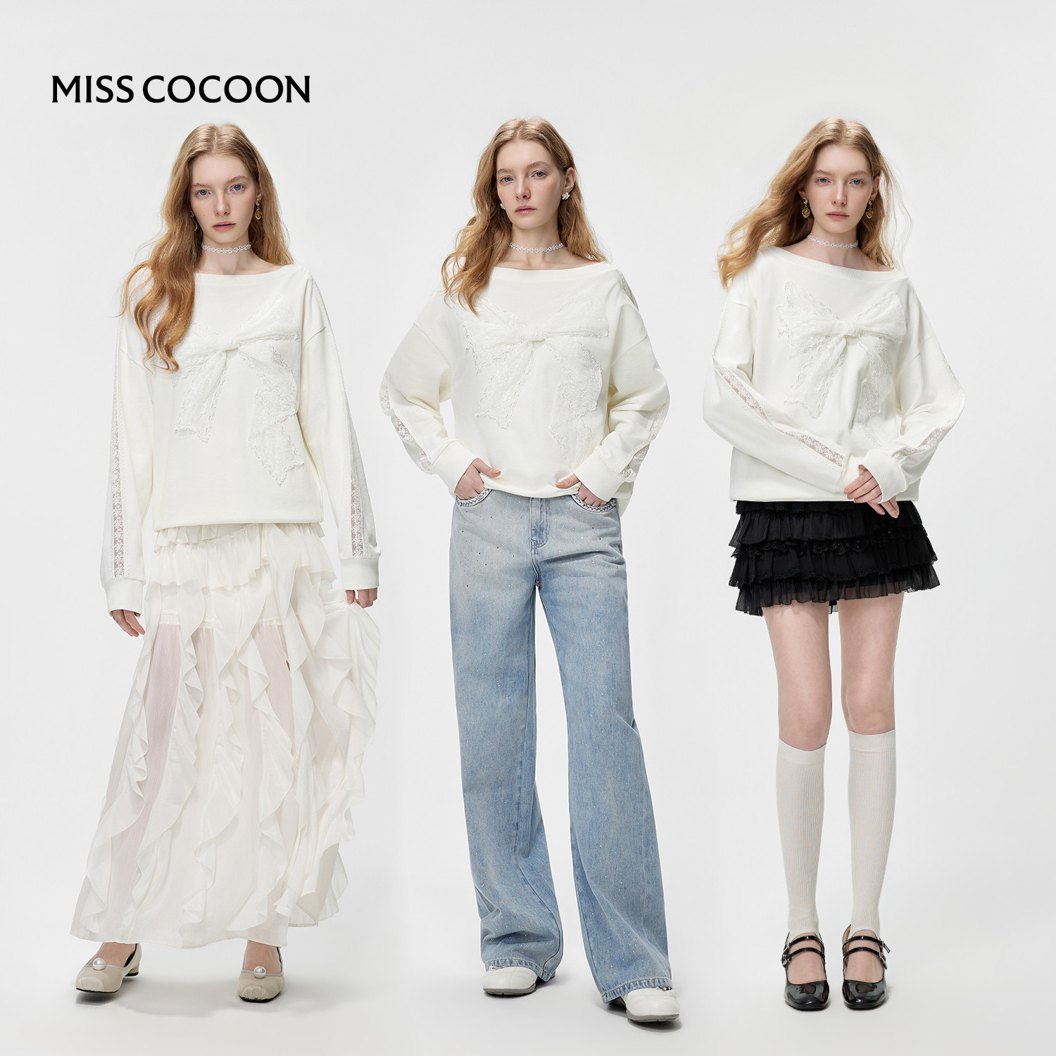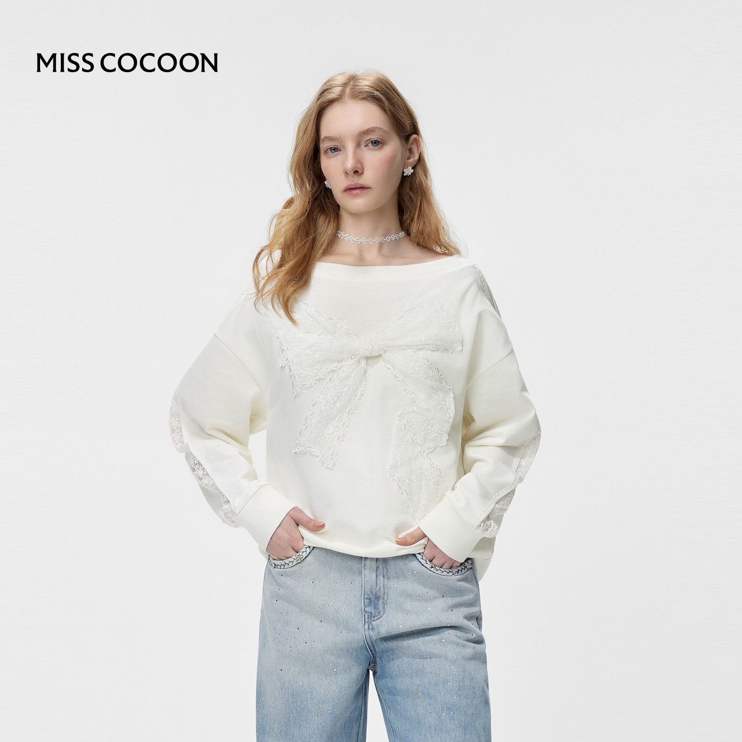 MISSCOCOON可可尼宽松短款白色上衣女2026春季新款蕾丝蝴蝶结卫衣