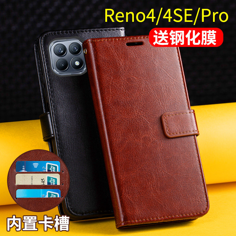适用opporeno4手机壳翻盖式皮套reno4SE外壳reno4pro保护套0pp0钱包插卡reon4女男款全包防摔ren4带盖por皮夹