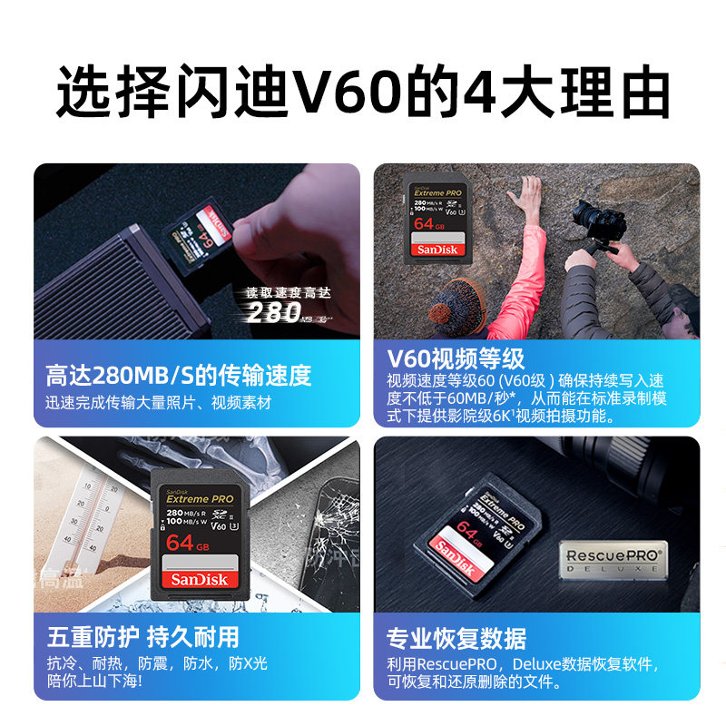 闪迪旗舰店128G内存卡sd卡 V60单反高速相机佳能富士通用存储卡