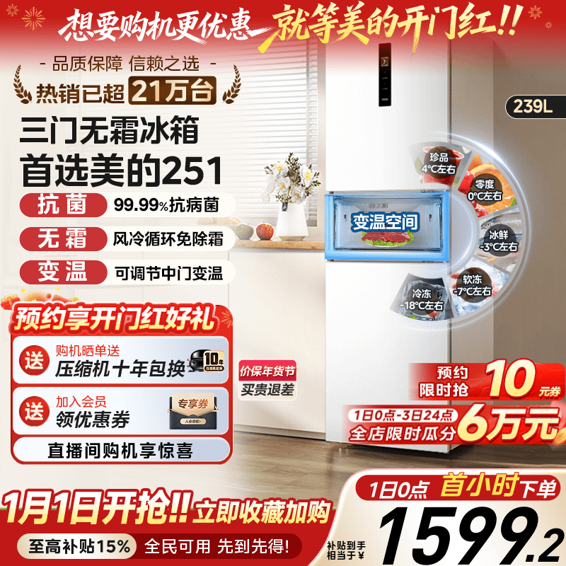 美的283三开门电冰箱一级能效家用变频风冷无霜小型超薄官方租房