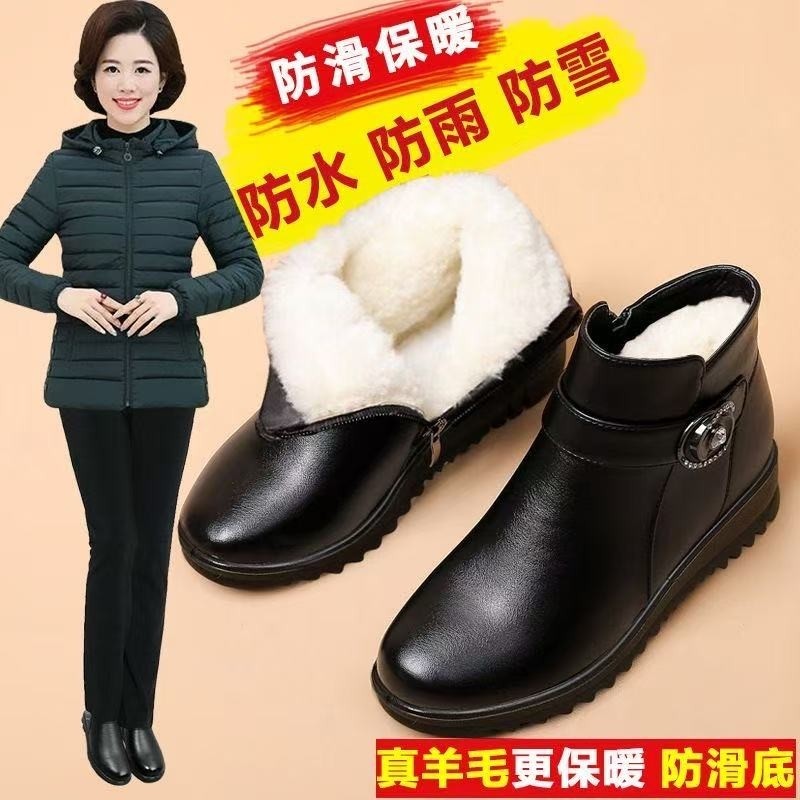 妈妈冬季短靴平底防滑保暖棉鞋老人加厚皮鞋奶奶中老年老北京棉靴