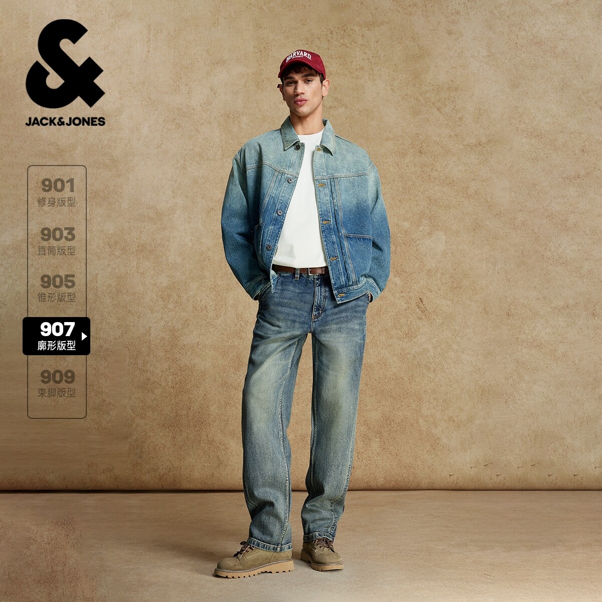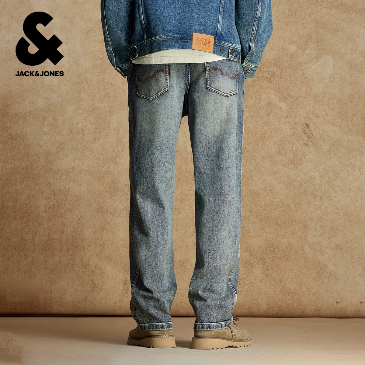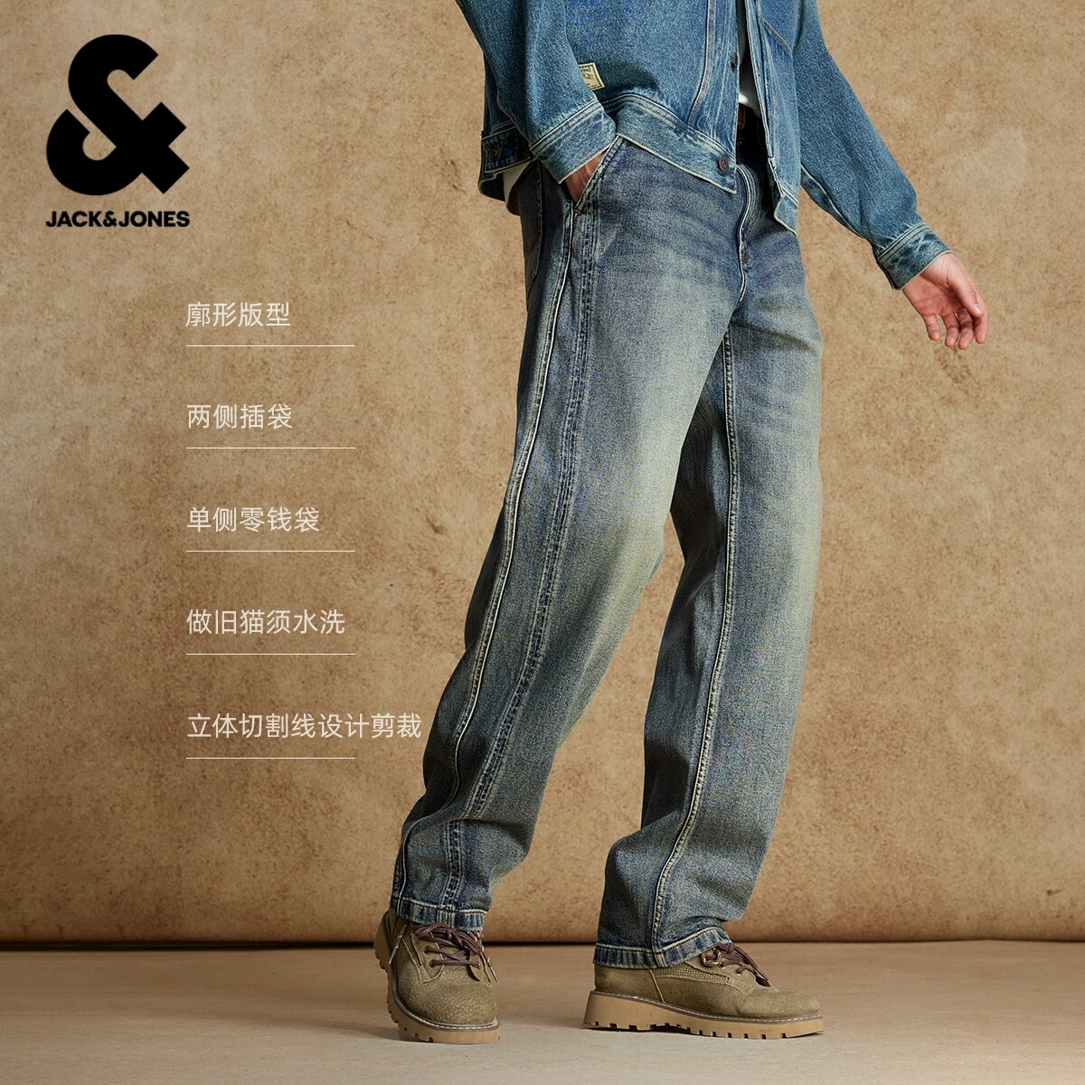 杰克琼斯春季牛仔裤长裤子深牛仔蓝廓形做旧猫须水洗潮流百搭休闲