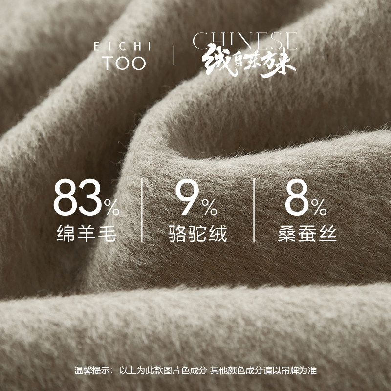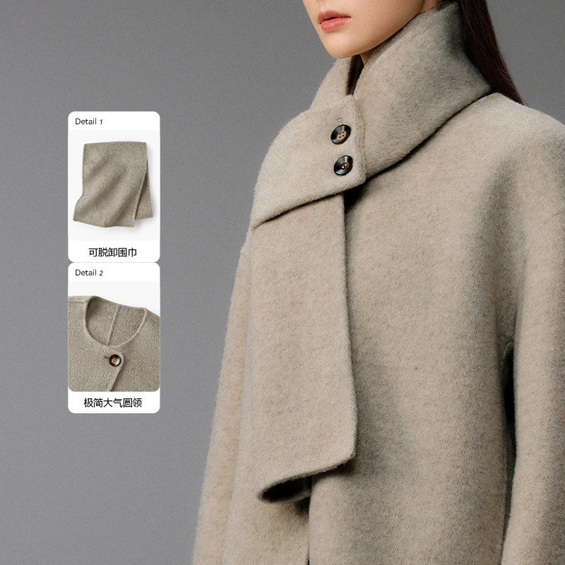 RUISHI芮时重磅驼绒桑蚕丝羊毛慵懒两穿领灰色毛呢大衣秋冬外套女