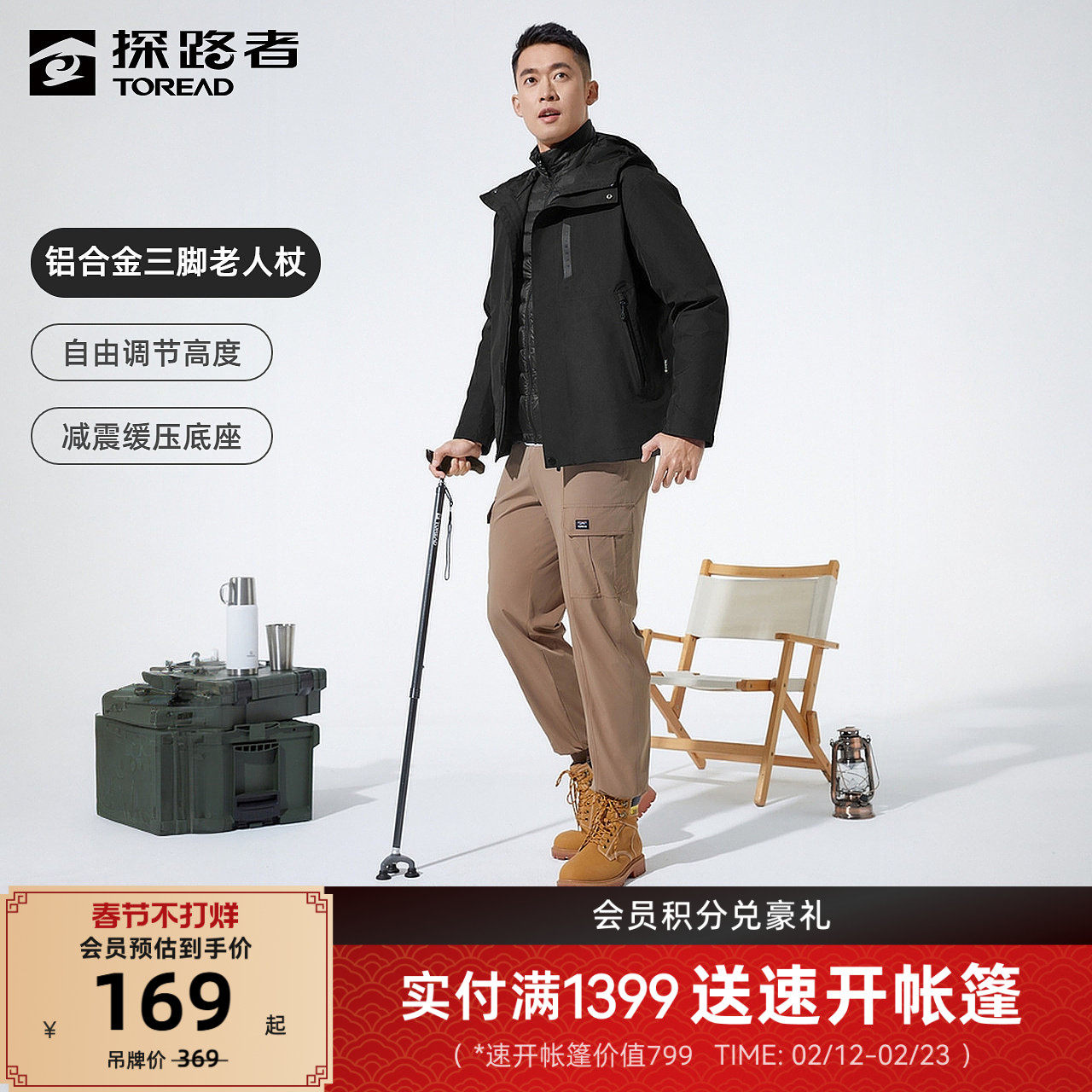 探路者铝合金三脚拐杖老人防滑实木户外爬山拐棍可伸缩多功能手杖