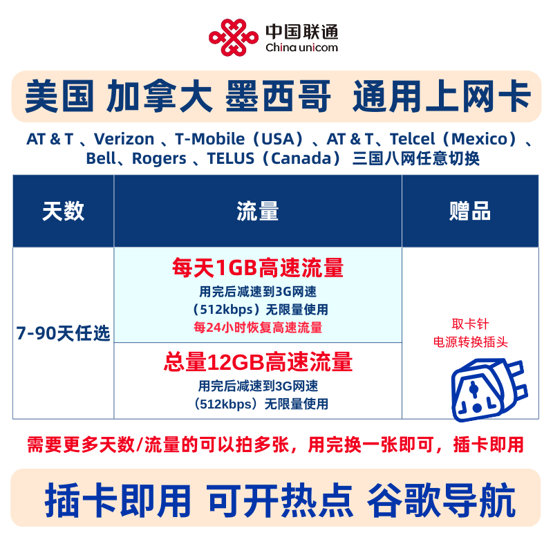 插卡即用,2026-12-31前插卡随时启用 兼容iPhone/近3年安卓旗舰机,部分旧款/中低端安卓机不兼容 3国8网任用AT&T Verizon T-Mobile Telcel Bell Rogers TELUS 美国加拿大墨西哥 美加墨三国通用 去领券购买 ->
