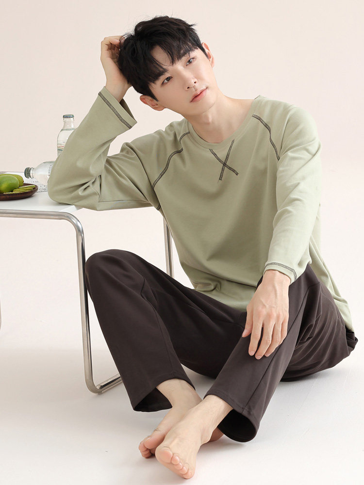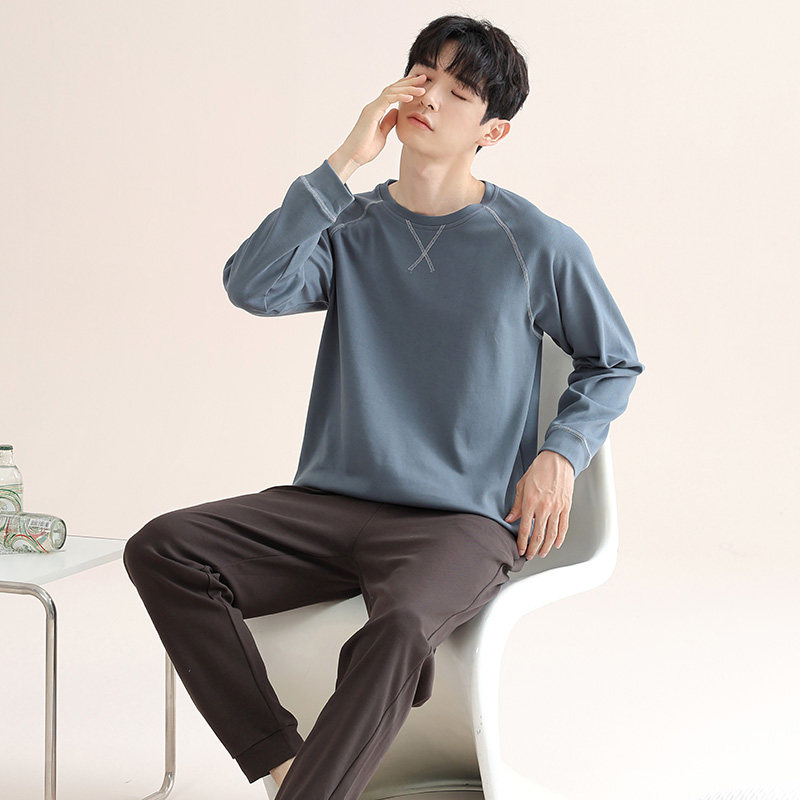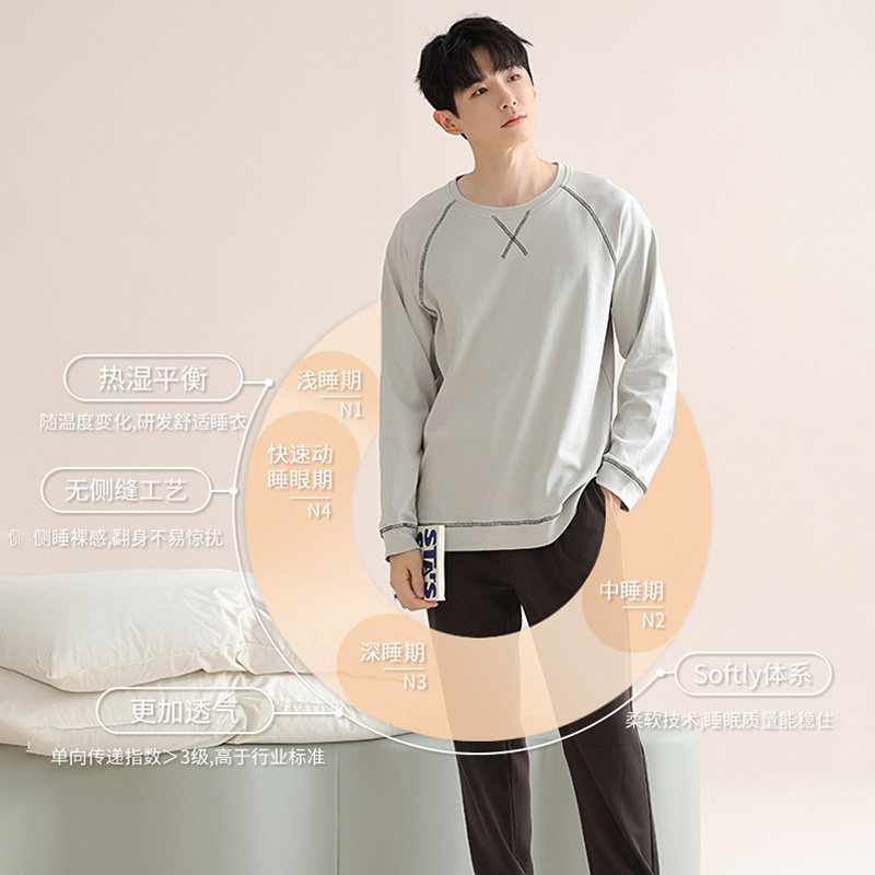宜而爽裸感男士柔软莫代尔睡衣宽松透气圆领长袖长裤家居服套装