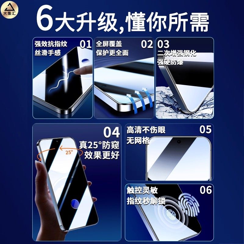 [不沾指纹]适用iPhone17/16钢化膜苹果15/14手机13promax防窥12全屏XR/xsmax全包11贴X防摔8por高清plus