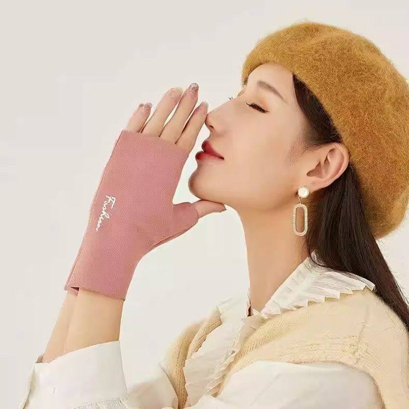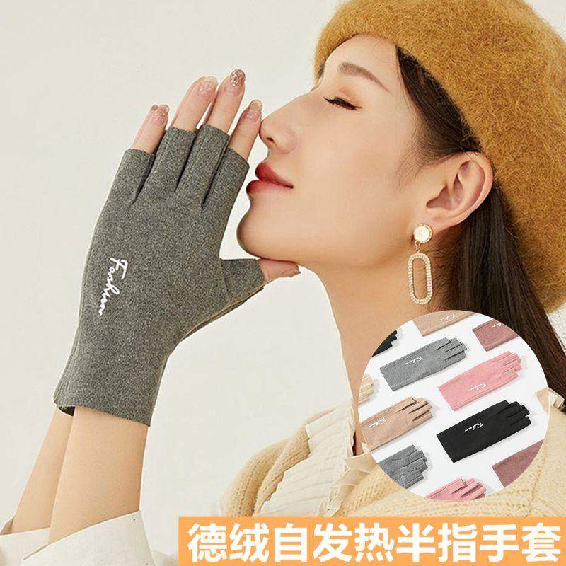 自发热德绒半指手套女秋冬季保暖防寒学生写字办公打字漏指手套