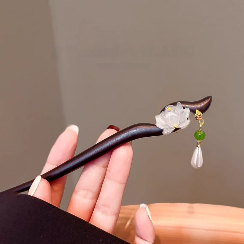 古风双面莲花檀木簪子女中式步摇流苏盘发簪子简约发钗旗袍头饰
