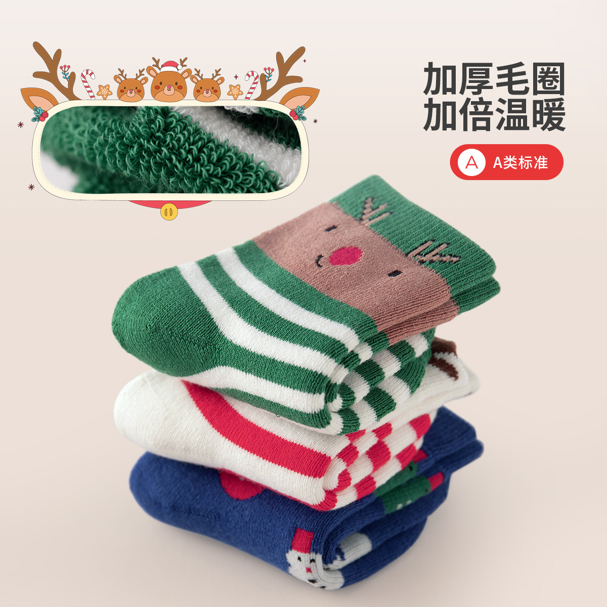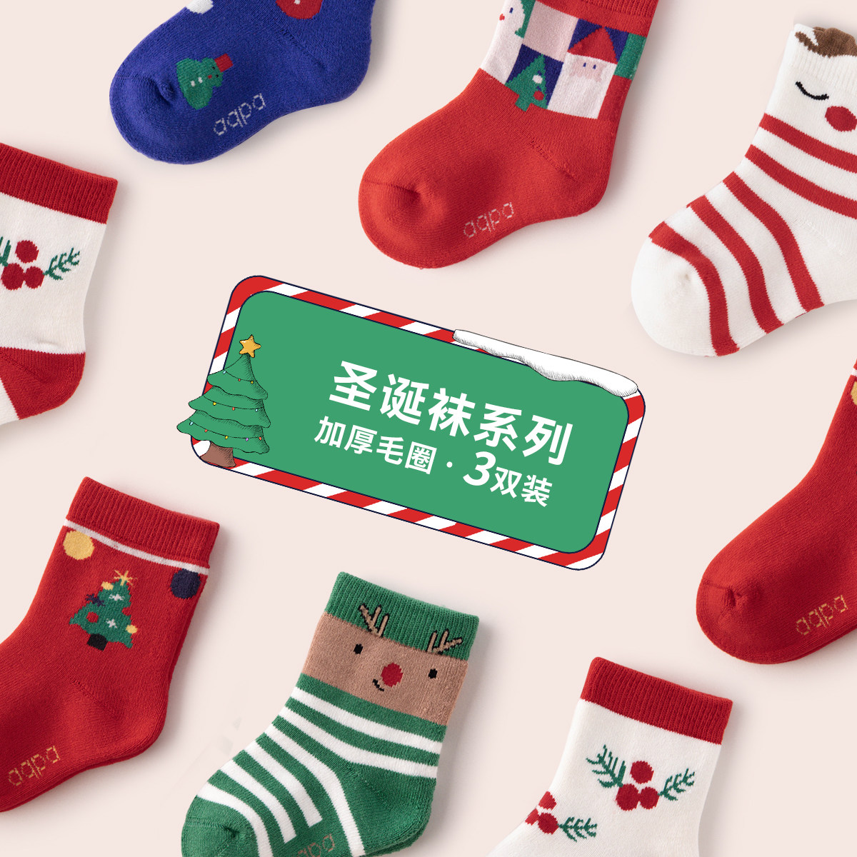 aqpa爱帕儿童袜子三双装婴幼儿圣诞新年秋冬季宝宝加厚毛巾袜洋气