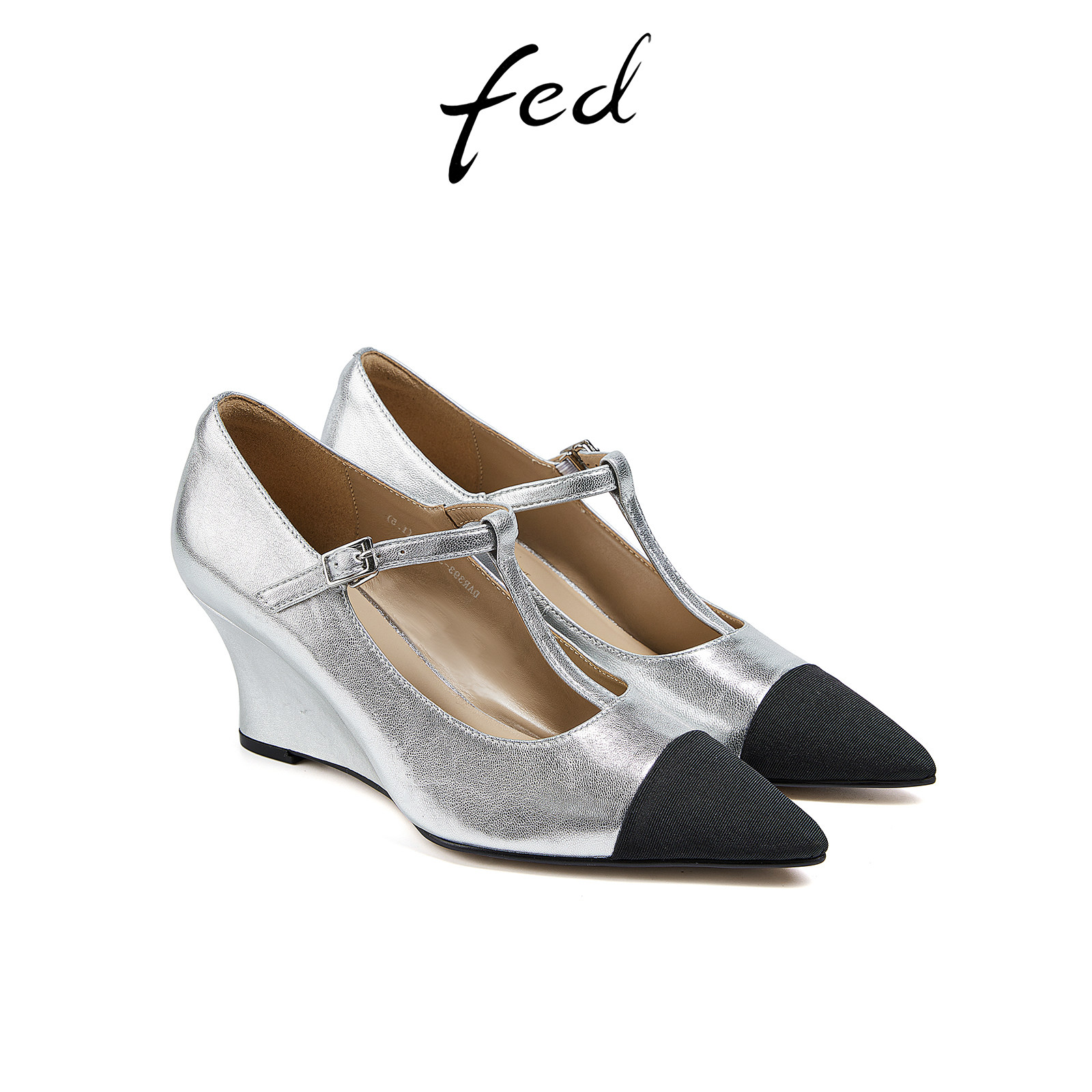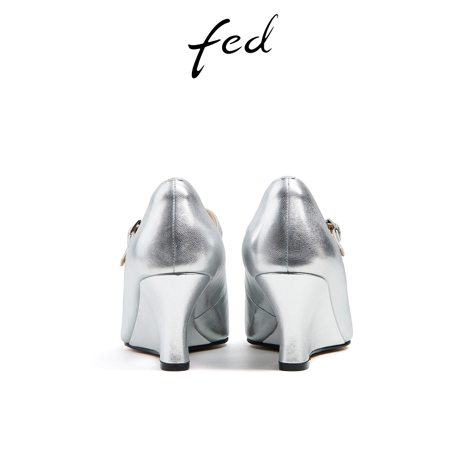 fed银色玛丽珍鞋女秋季新款女鞋尖头坡跟真皮单鞋女款D0530-ZF393