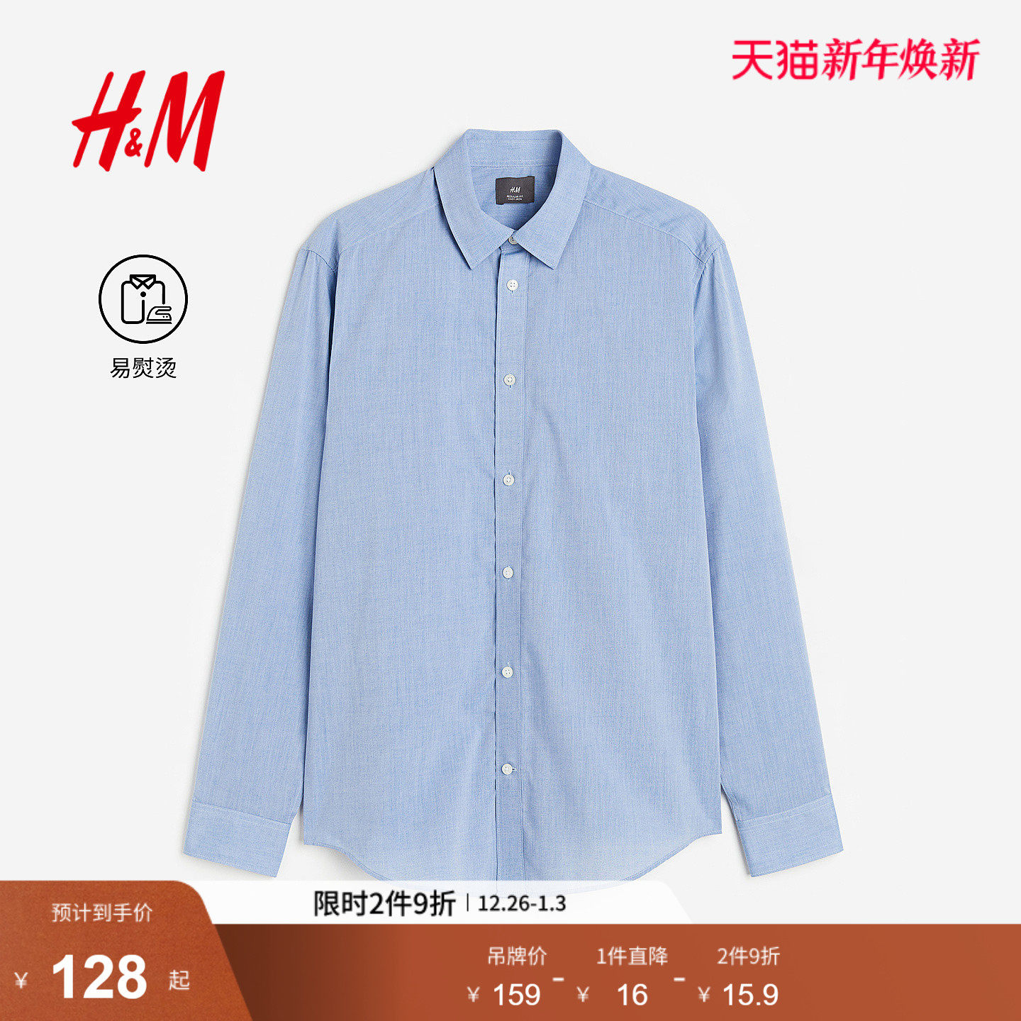 HM男装衬衫冬季易熨烫休闲通勤商务翻折领长袖质感衬衣0977237