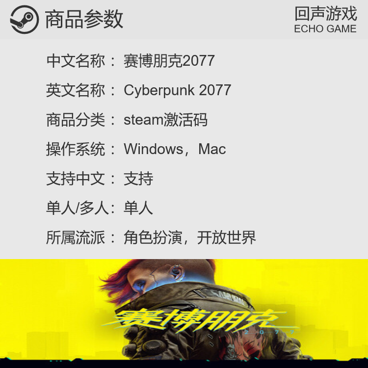 Steam正版 国区key 赛博朋克2077 Cyberpunk2077 激活码 现货入库