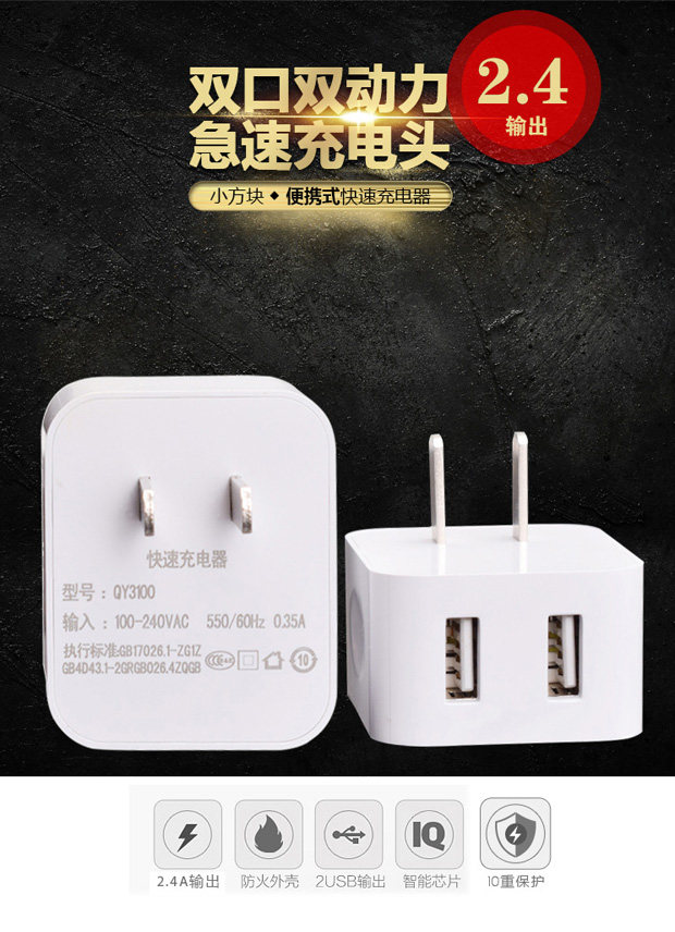 智能5v2A充电器头充电头通用双口单USB插头摄像头电源侧插充电器