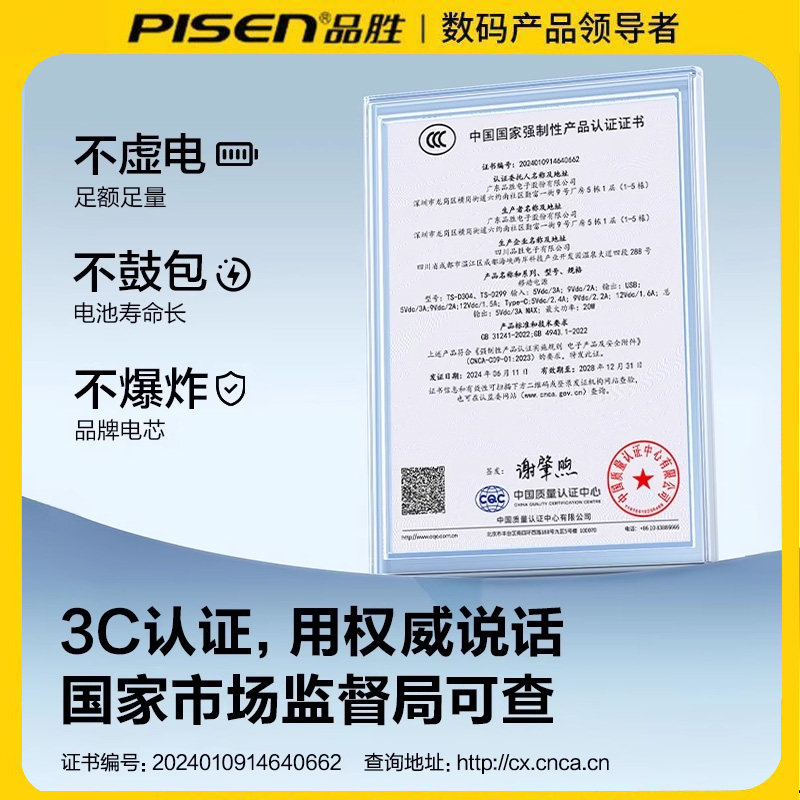 【充电宝3C认证】品胜20000毫安充电宝自带四线大容量超薄小巧便携政府补贴移动电源适用苹果17华为可上飞机