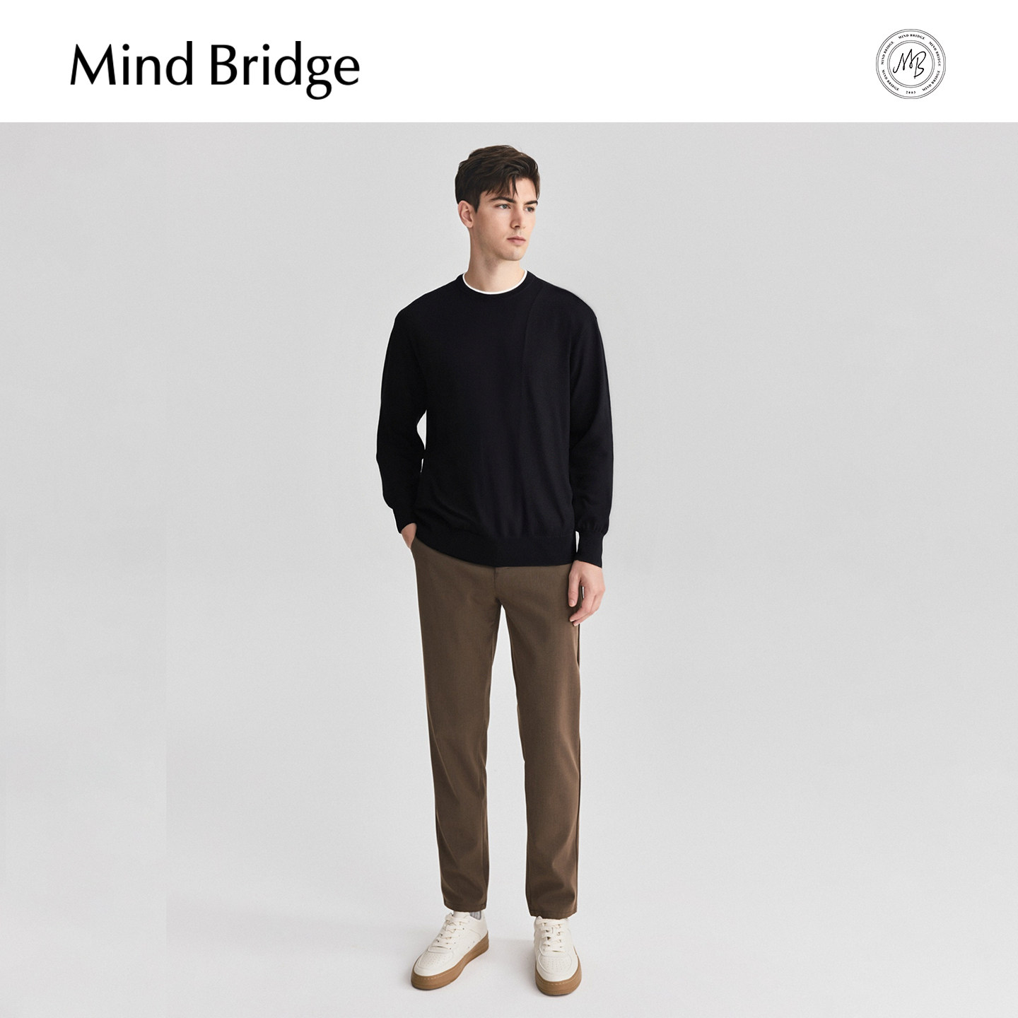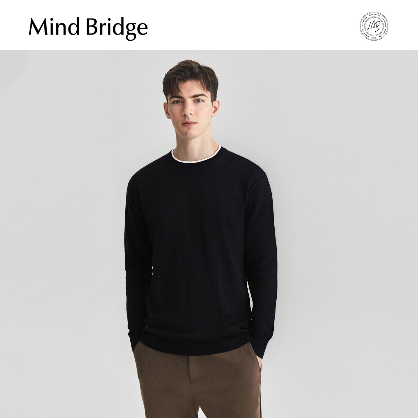MindBridge【绵羊毛】2025年冬季假两件针织男士纯色休闲圆领毛衣