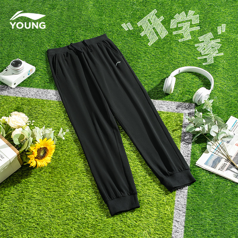 李宁儿童裤子2026春季男童卫裤青少年宽松透气黑色棉质薄款运动裤