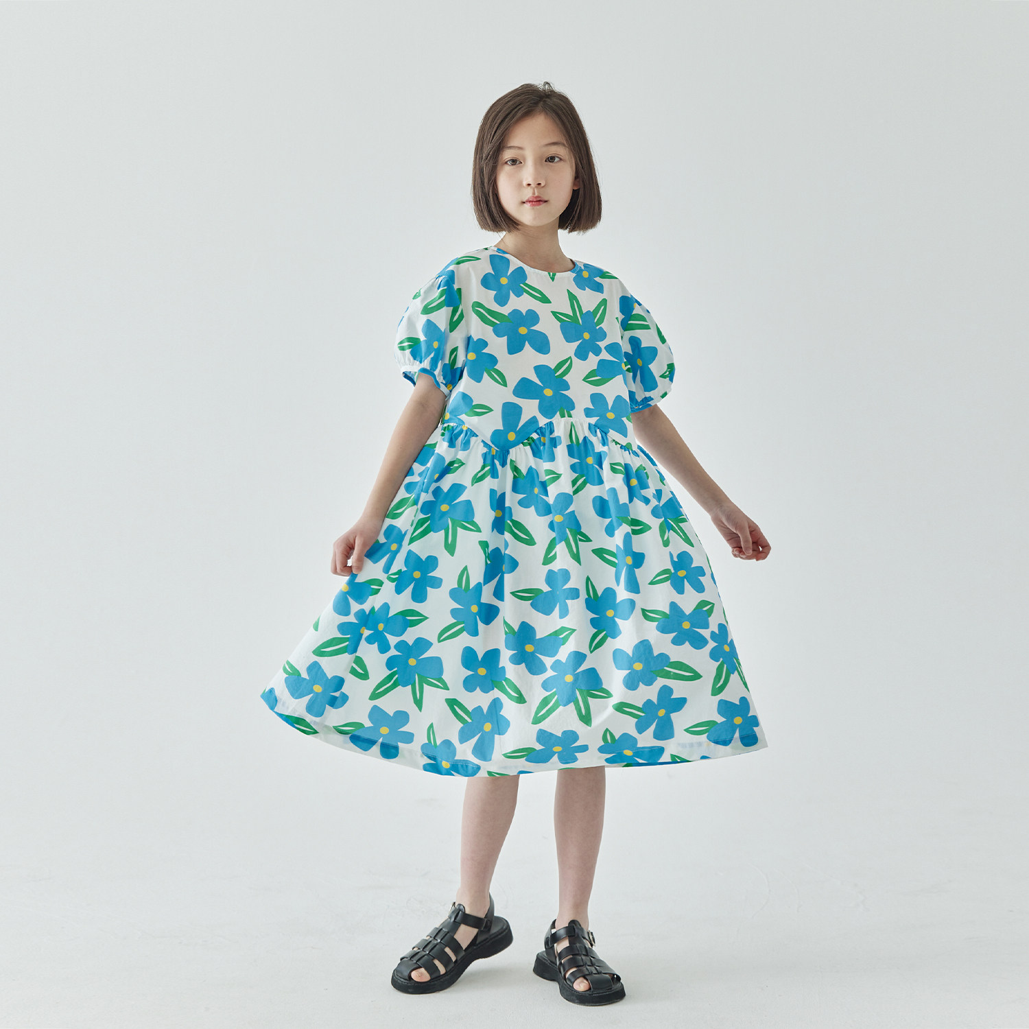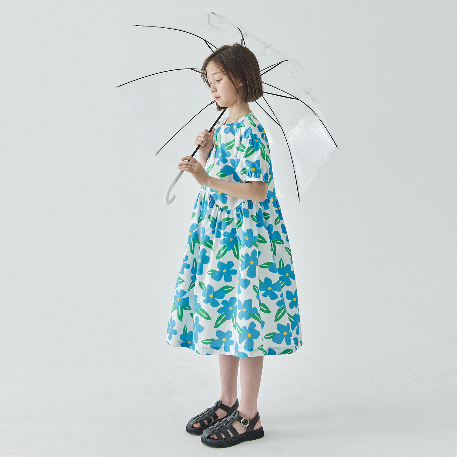 棵初2025夏季新品女童蓝色全棉印花连衣裙中大童泡泡袖褶皱碎花裙