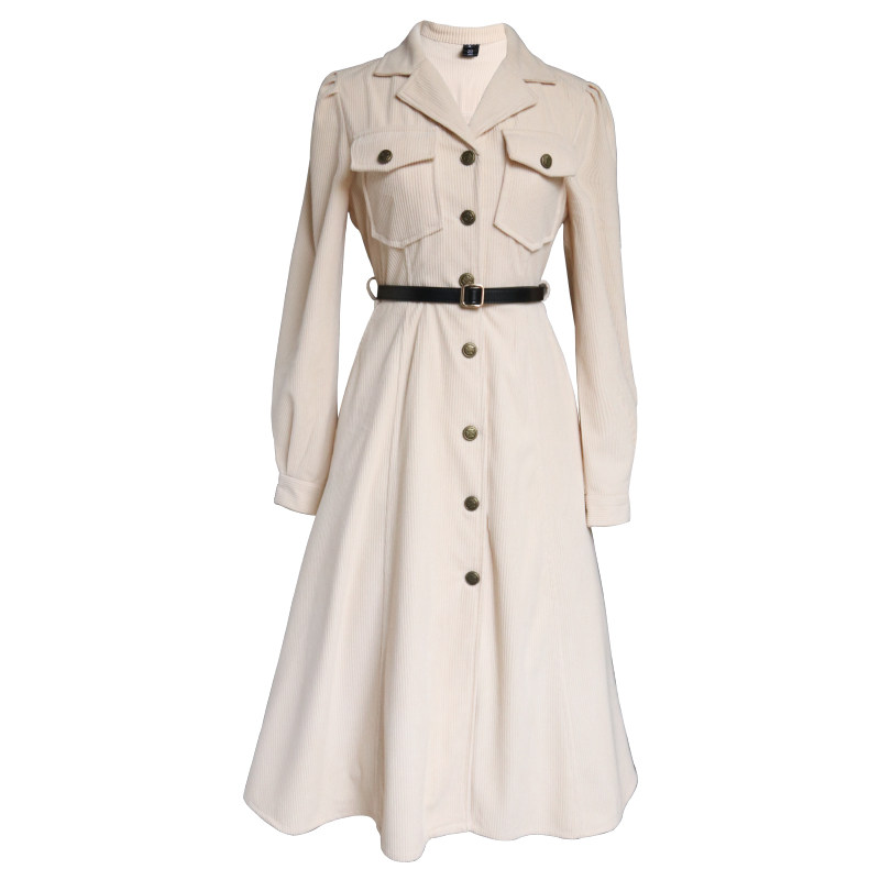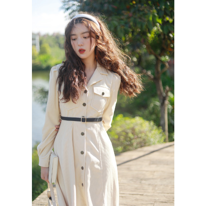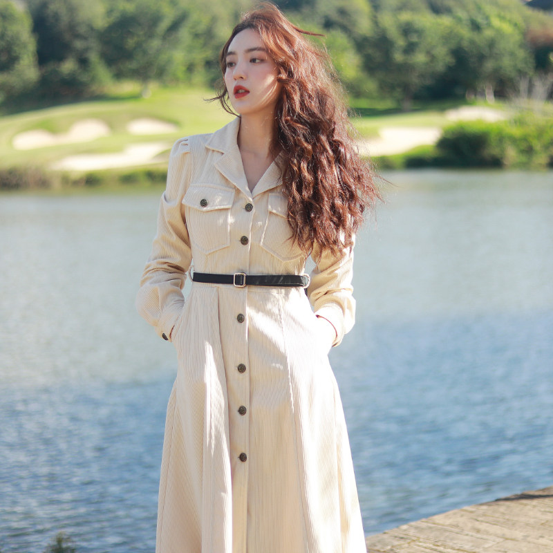 JUJU定制春秋季港风气质法式西装领工装裙米色长袖灯芯绒连衣裙女