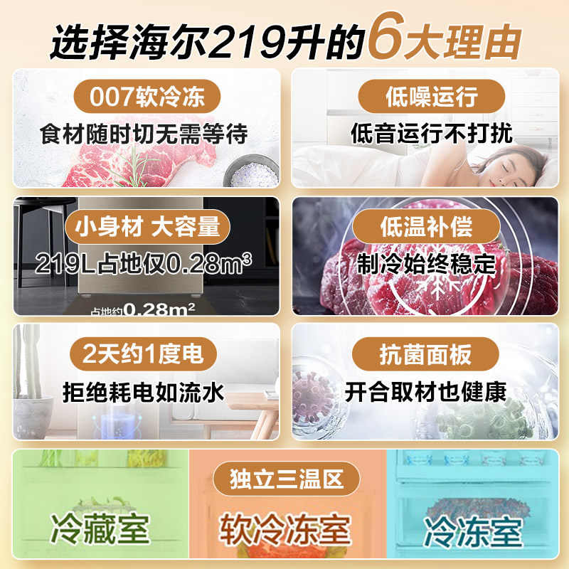 [换新补贴]海尔三开门219L/212升电冰箱家用小型节能租房宿舍旗舰