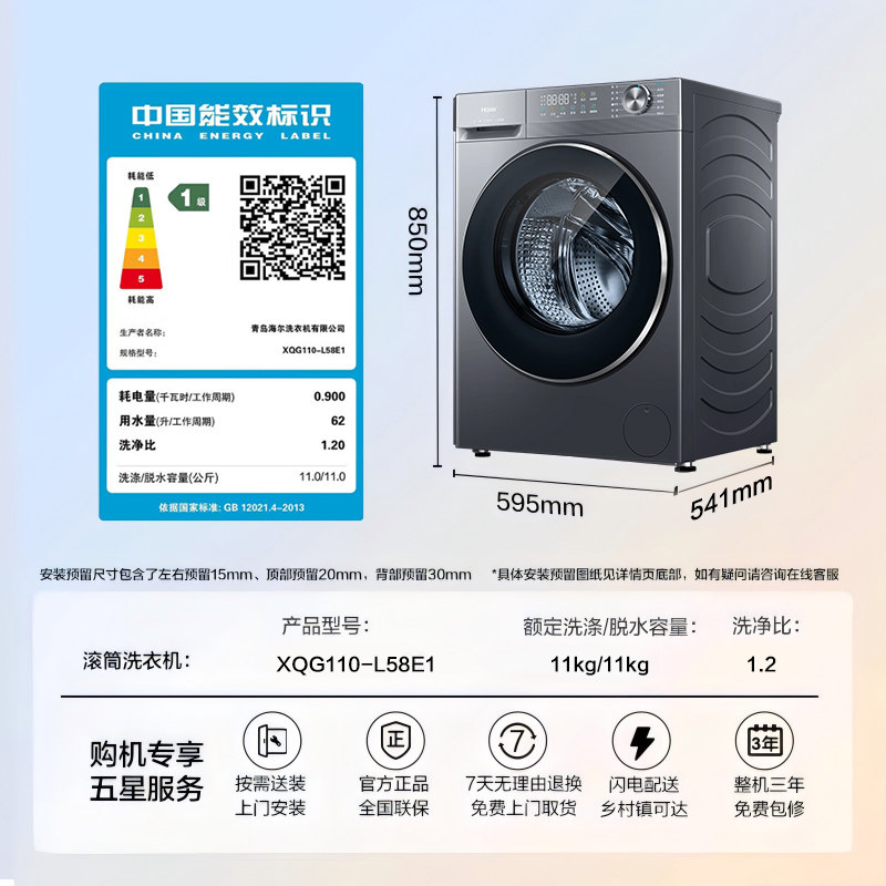 海尔滚筒洗衣机11公斤kg全自动家用大容量超薄洗烘58E官方旗舰