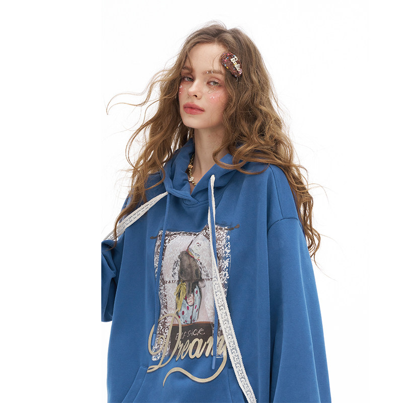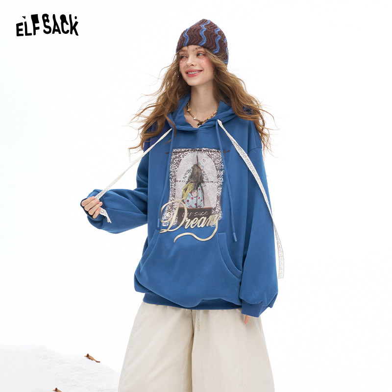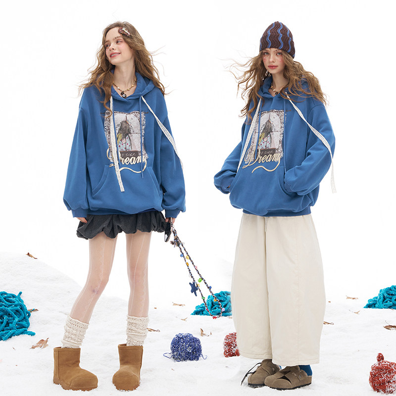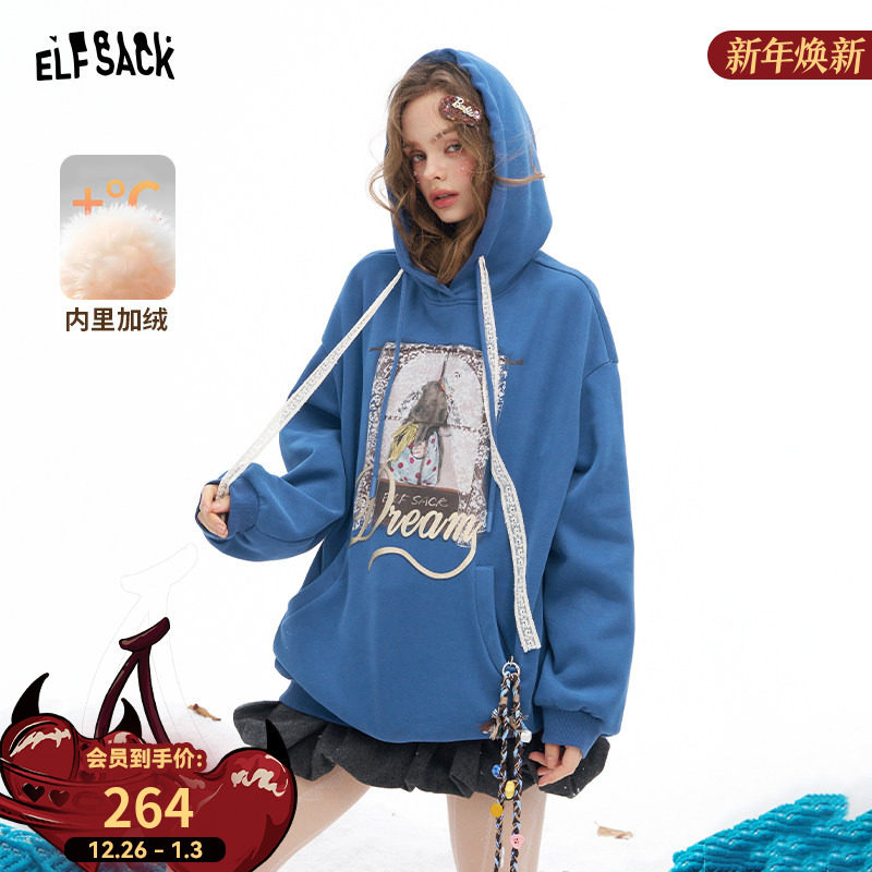 妖精的口袋蓝色印花连帽加绒短款卫衣女2025冬新款慵懒风宽松上衣