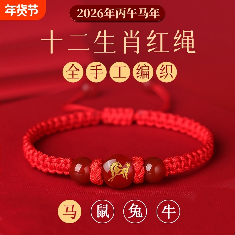 新款马年太岁红绳手链手绳编织红玛瑙本命年属马兔鼠牛红色护身符