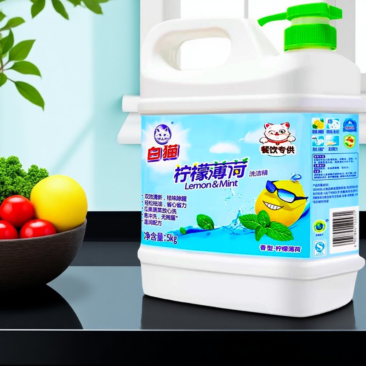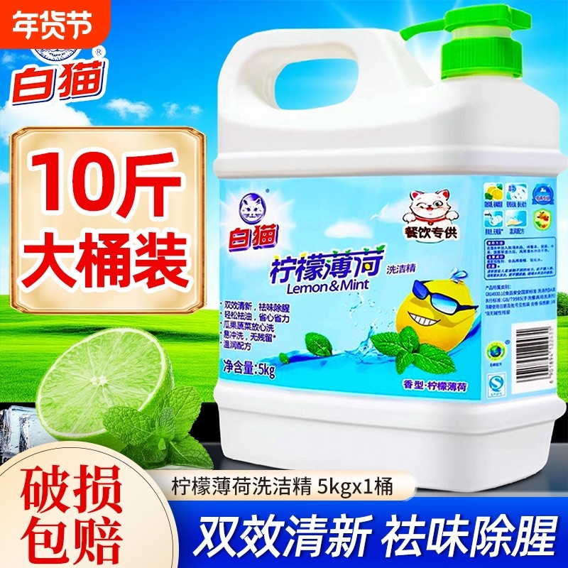 10斤白猫柠檬薄荷洗洁精5kg家庭装大桶餐饮专用按压瓶洗涤洗碗液