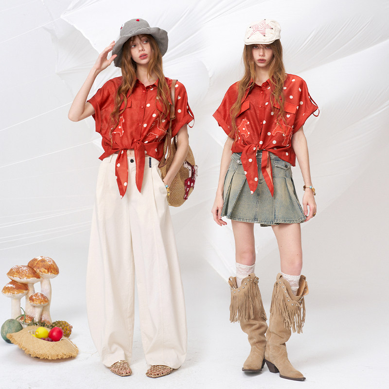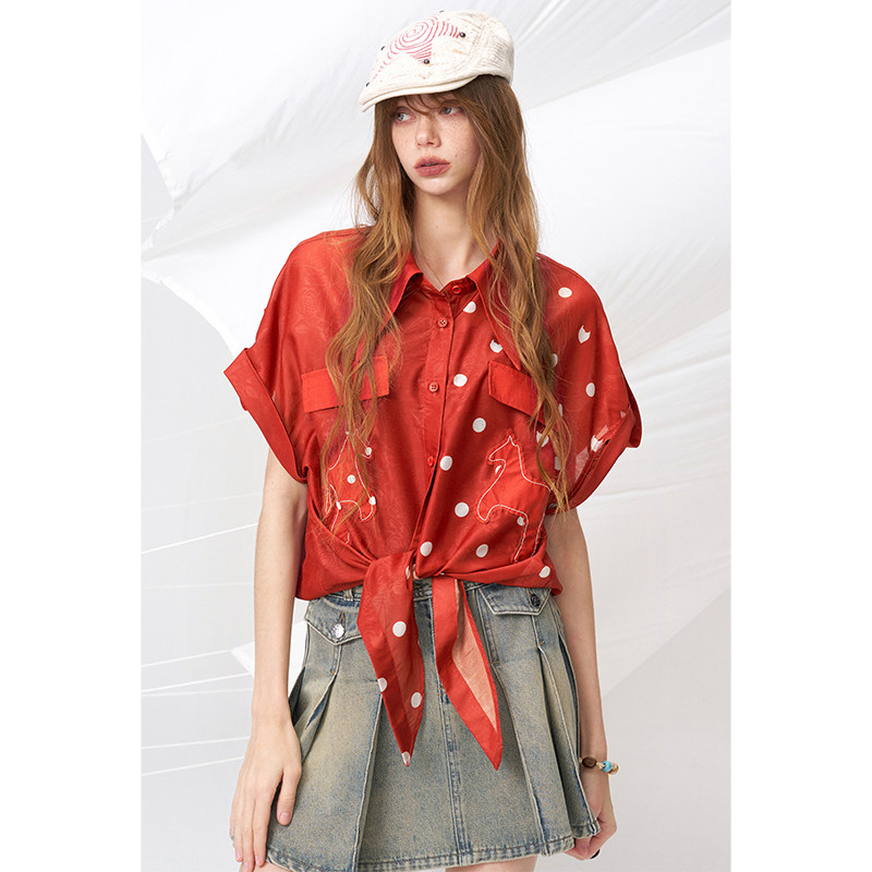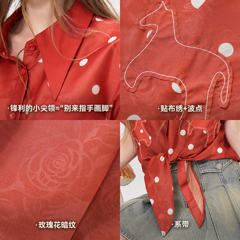 妖精的口袋波点系带红色短袖衬衫女2026夏季新款复古港风甜美上衣