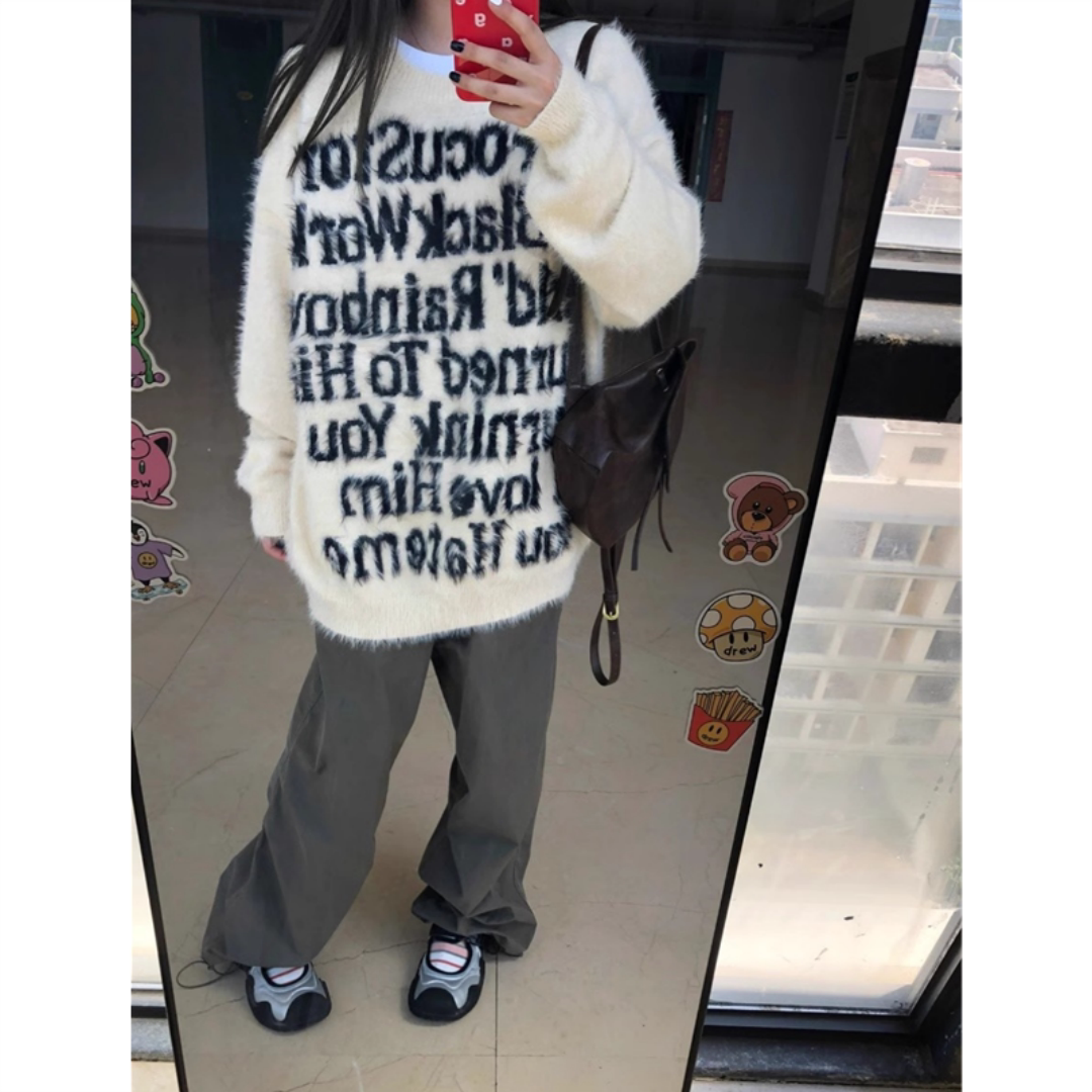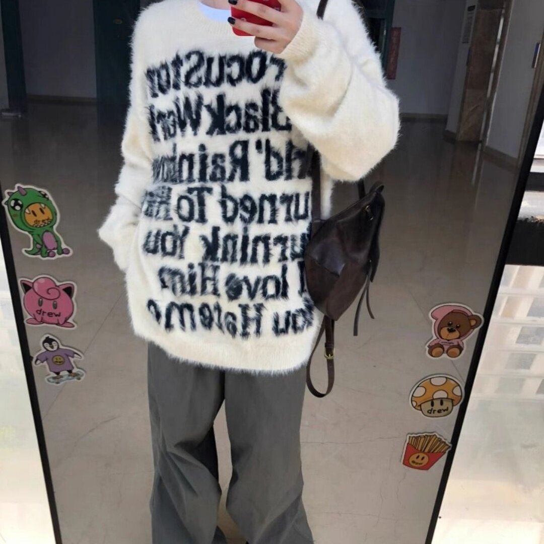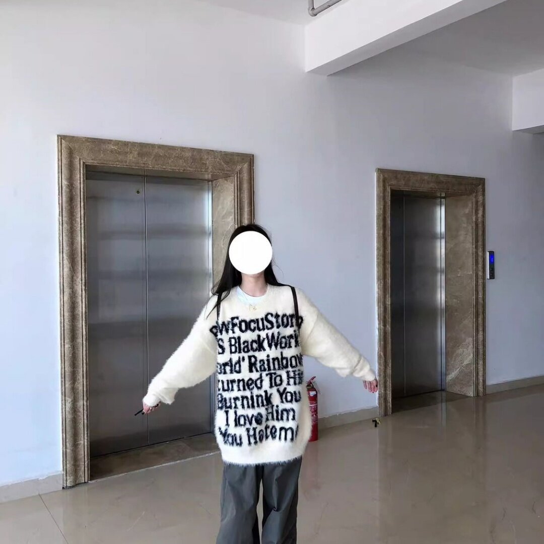 oversize慵懒风字母水貂绒套头秋冬大码内搭新款宽松加厚针织上衣