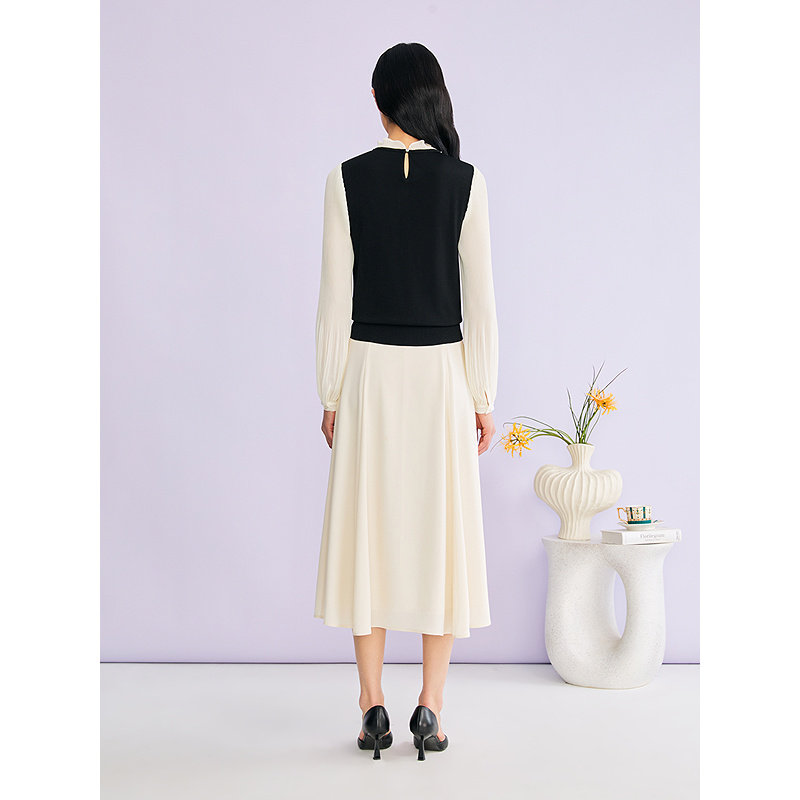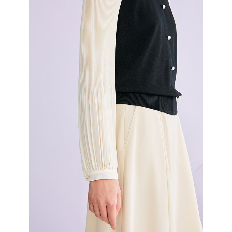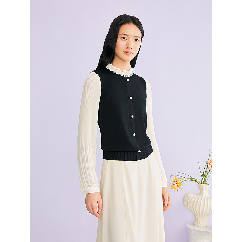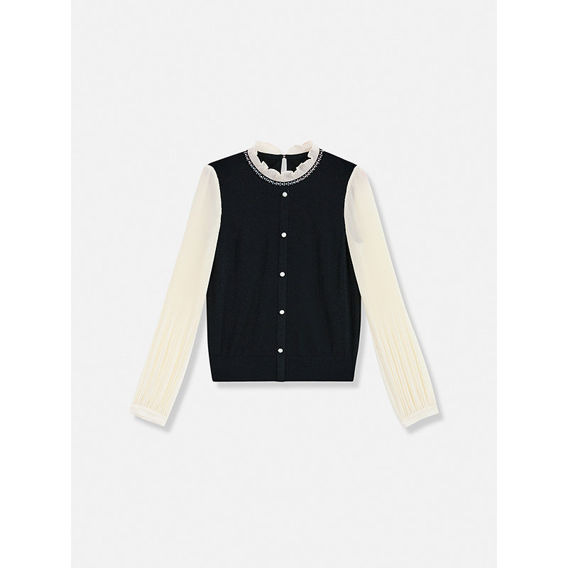 YINER音儿专选2026春季新款钉珠装饰荷叶边领拼接雪纺袖针织衫
