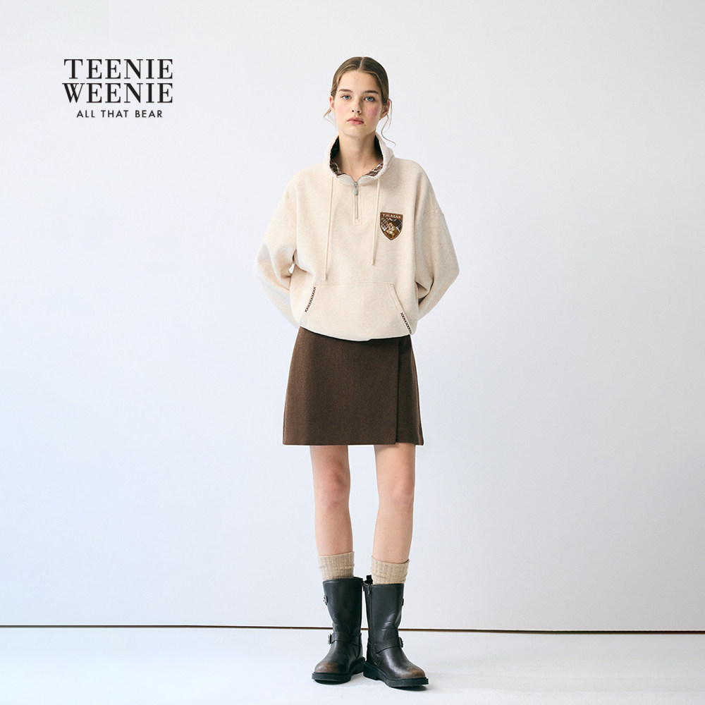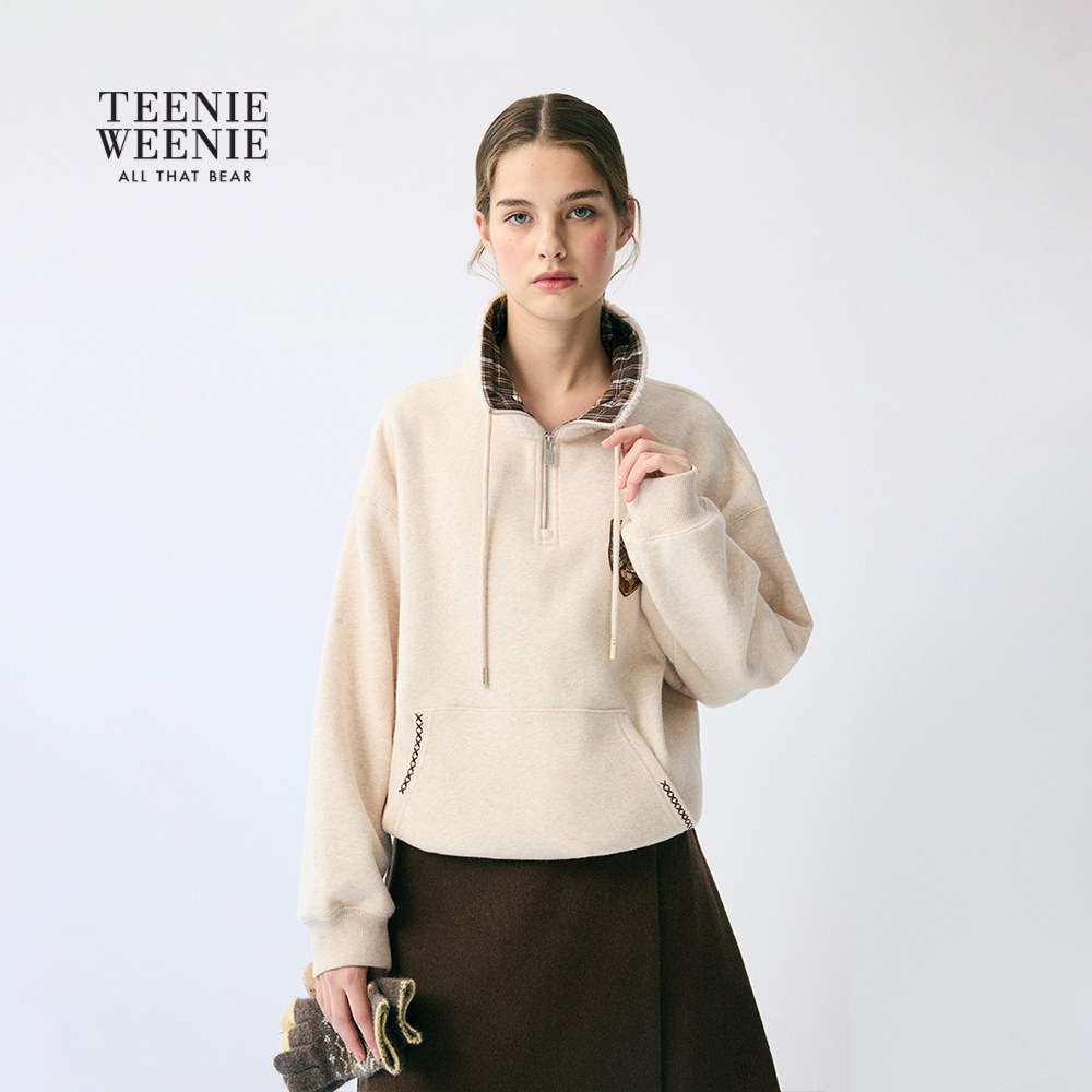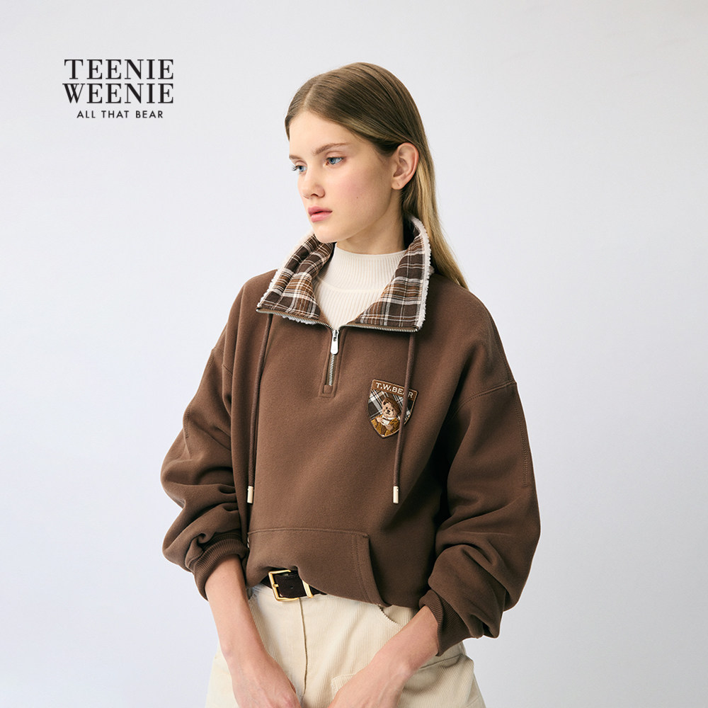 TeenieWeenie小熊女装卫衣秋冬季格纹拼接时髦翻领半拉链上衣外套