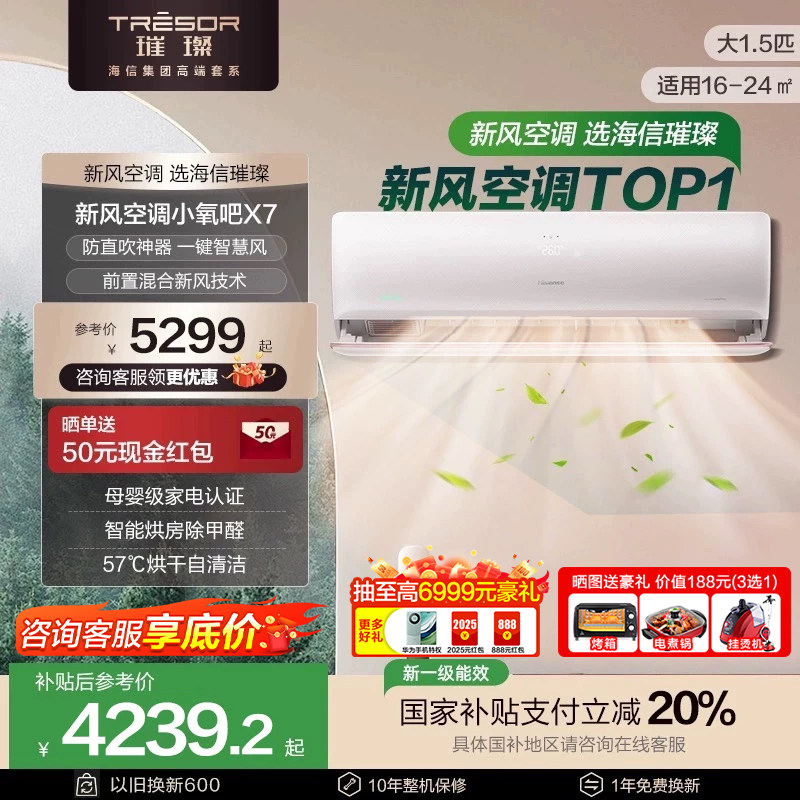 海信新风空调大1.5匹X7Pro挂机式家用一级变频防直吹卧室冷暖两用