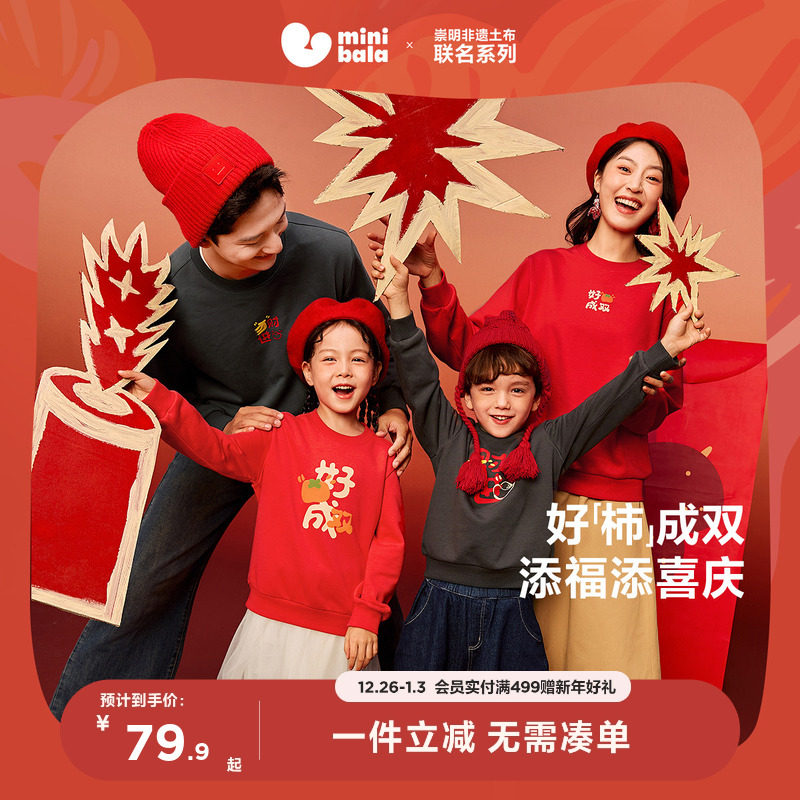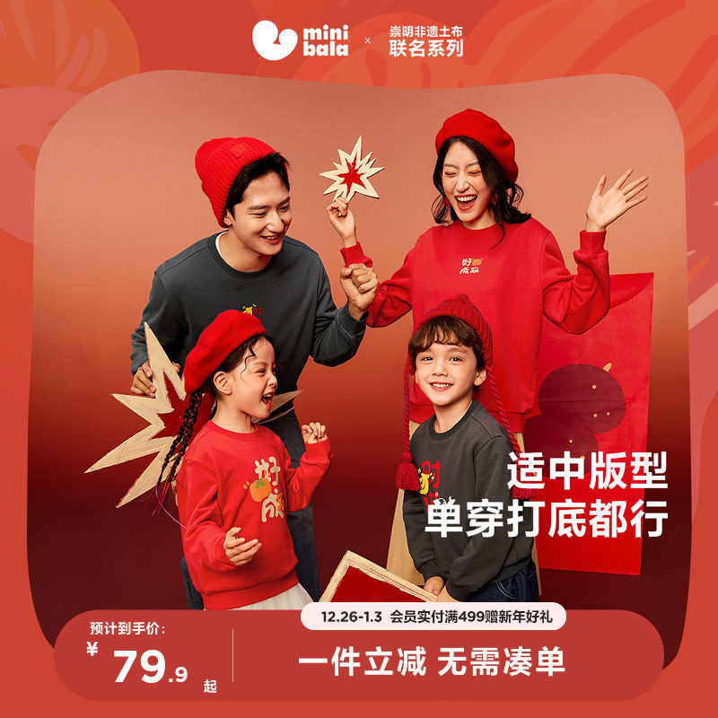 迷你巴拉巴拉男童女童卫衣冬一家三口儿童红色萌趣联名新年亲子装