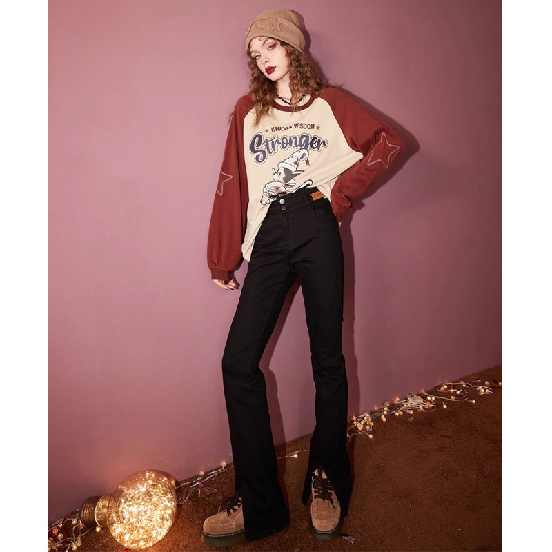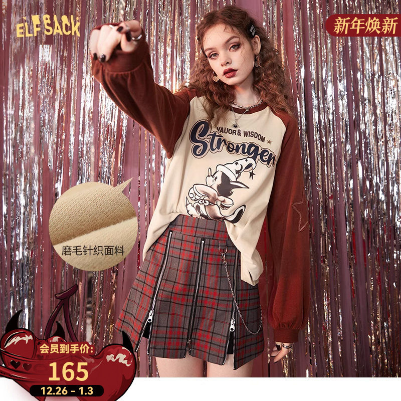妖精的口袋插肩印花长袖t恤女2025冬季新款内搭新年战袍红色上衣